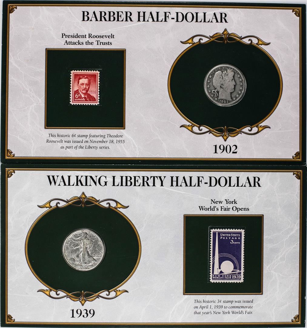 Lot of 1902-S Barber & 1939 Waking Liberty Half Dollar Coins and Stamp Panels