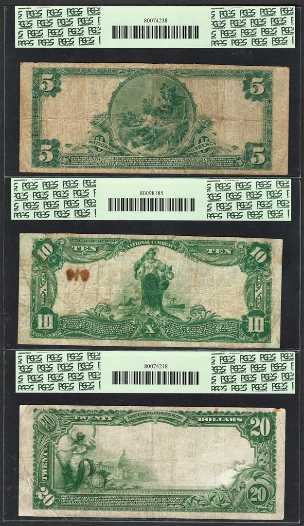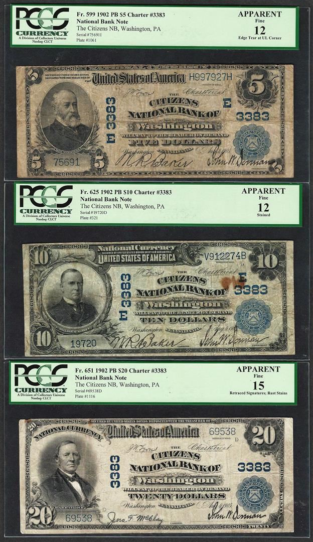 One Lot of 1902PB $5/10/20 Washington, PA CH# 3383 National Currency Notes PCGS F12/F15. PCGS Graded.