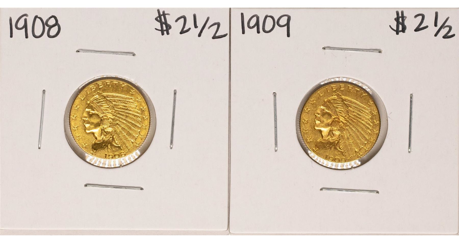 Lot of 1908-1909 $2 1/2 Indian Head Quarter Eagle Gold Coins