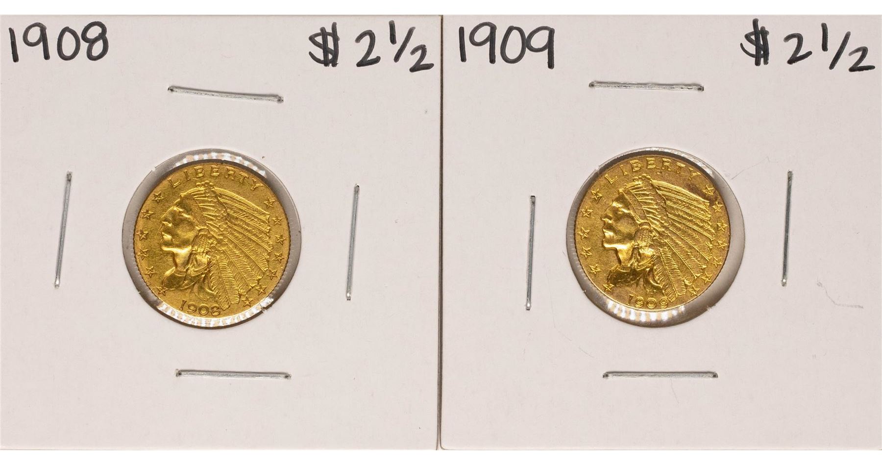 Lot of 1908-1909 $2 1/2 Indian Head Quarter Eagle Gold Coins
