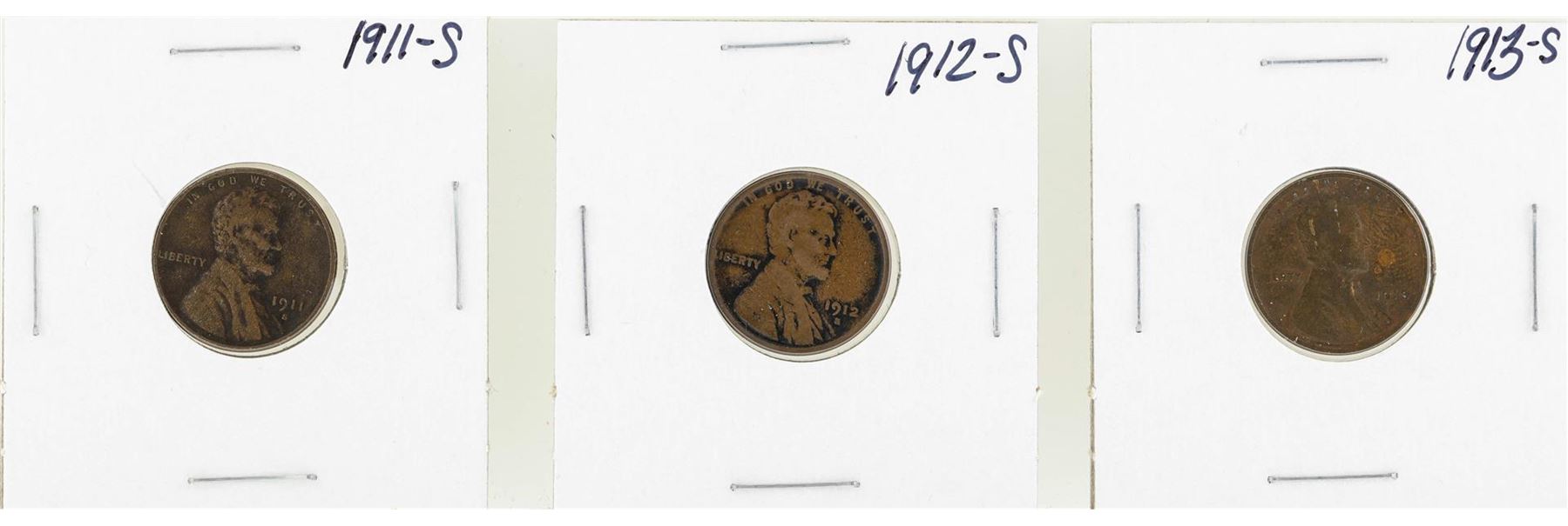 One Lot of 1911-S to 1913-S Lincoln Wheat Cent Coins.