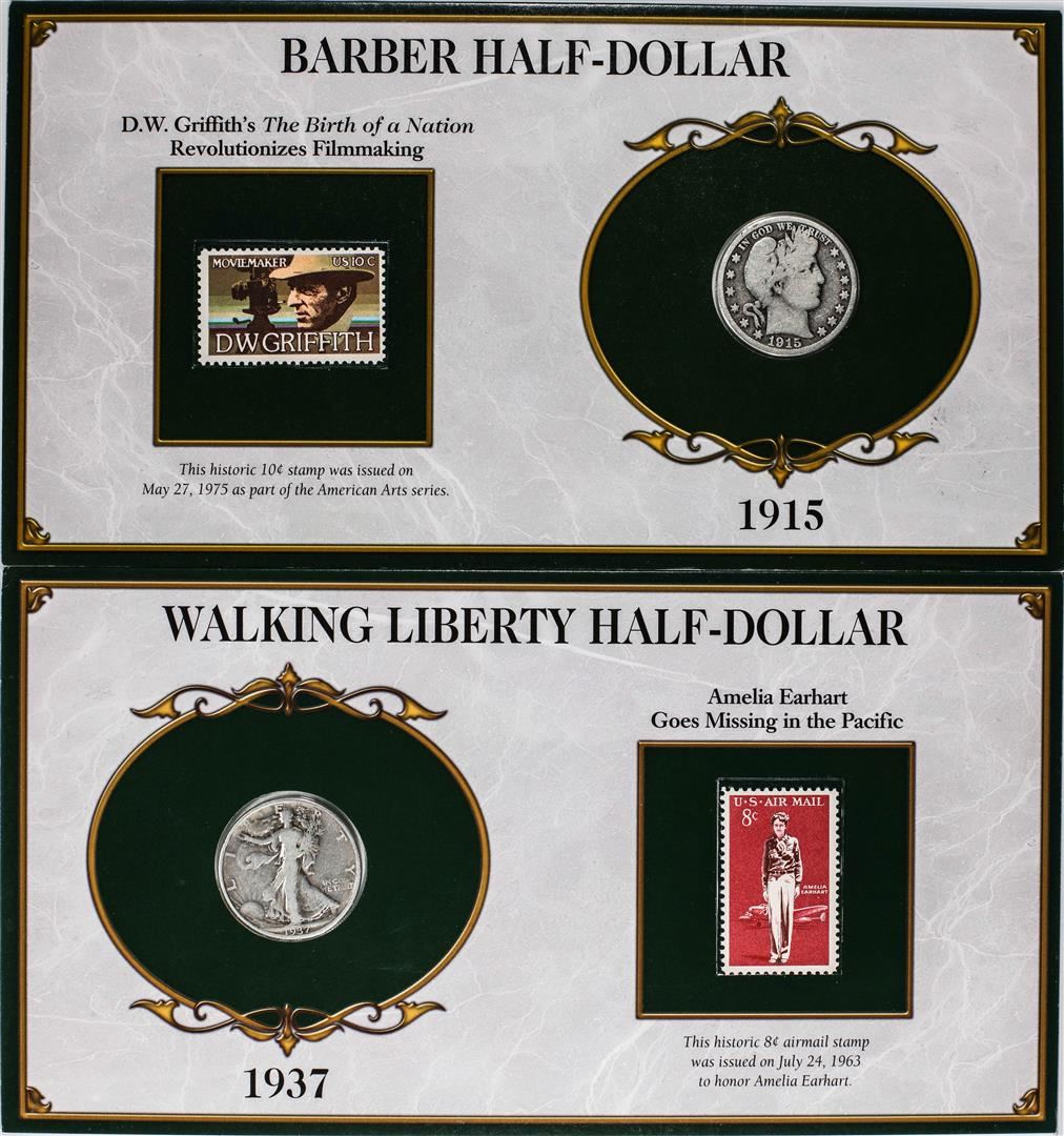 Lot of 1915-S Barber & 1937 Waking Liberty Half Dollar Coins and Stamp Panels
