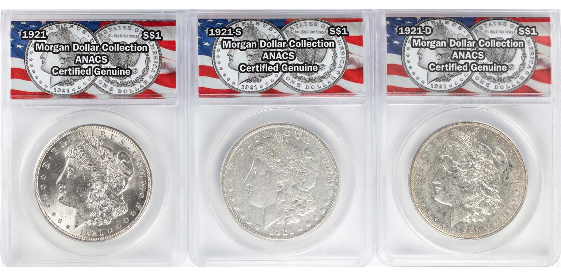 One Lot of 1921-P/D/S $1 Morgan Silver Dollar Coins ANACS Certified Genuine. ANACS Certified.