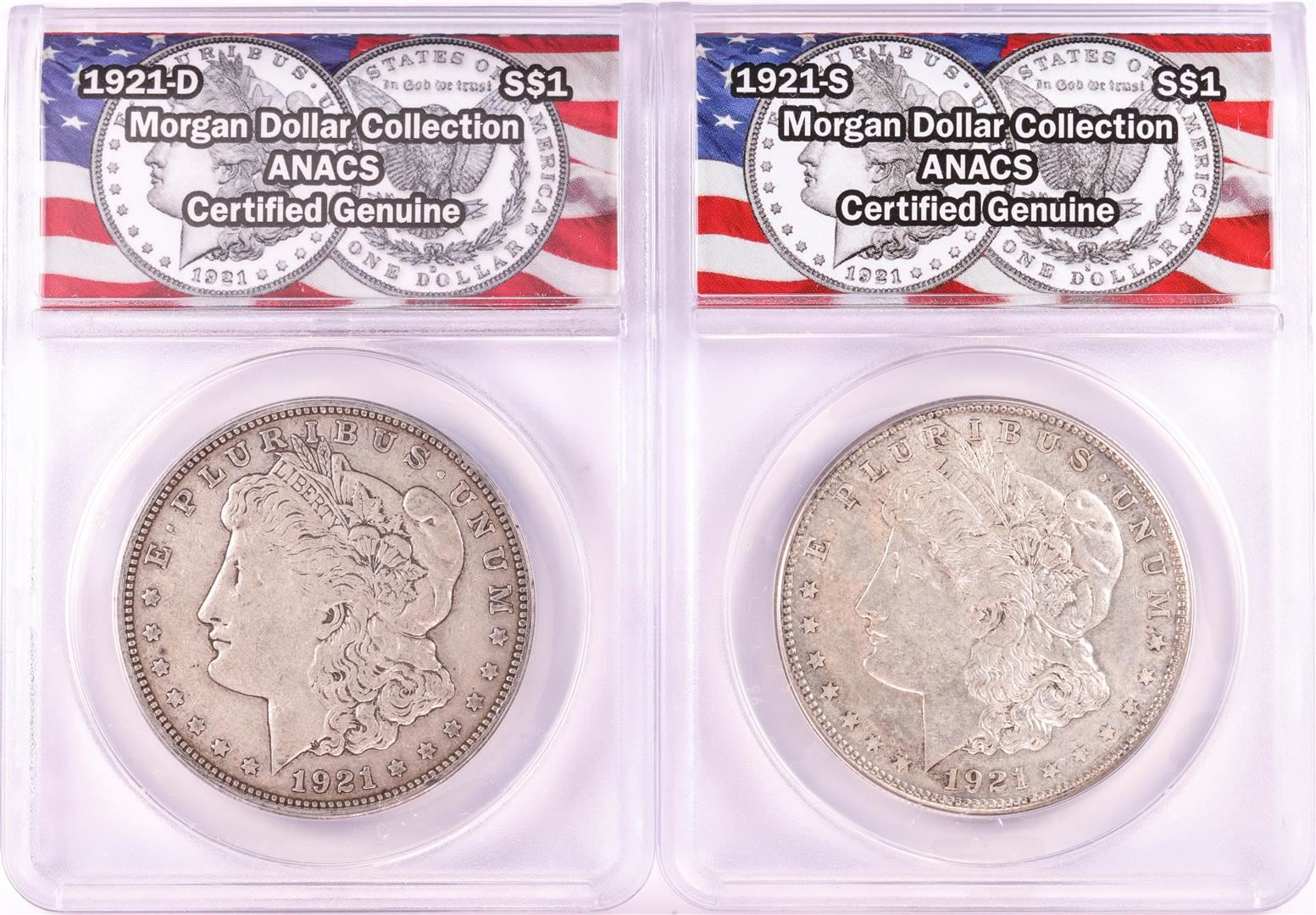 One Lot of 1921-S & 1921-D $1 Morgan Silver Dollar Coins ANACS Genuine. ANACS Certified.