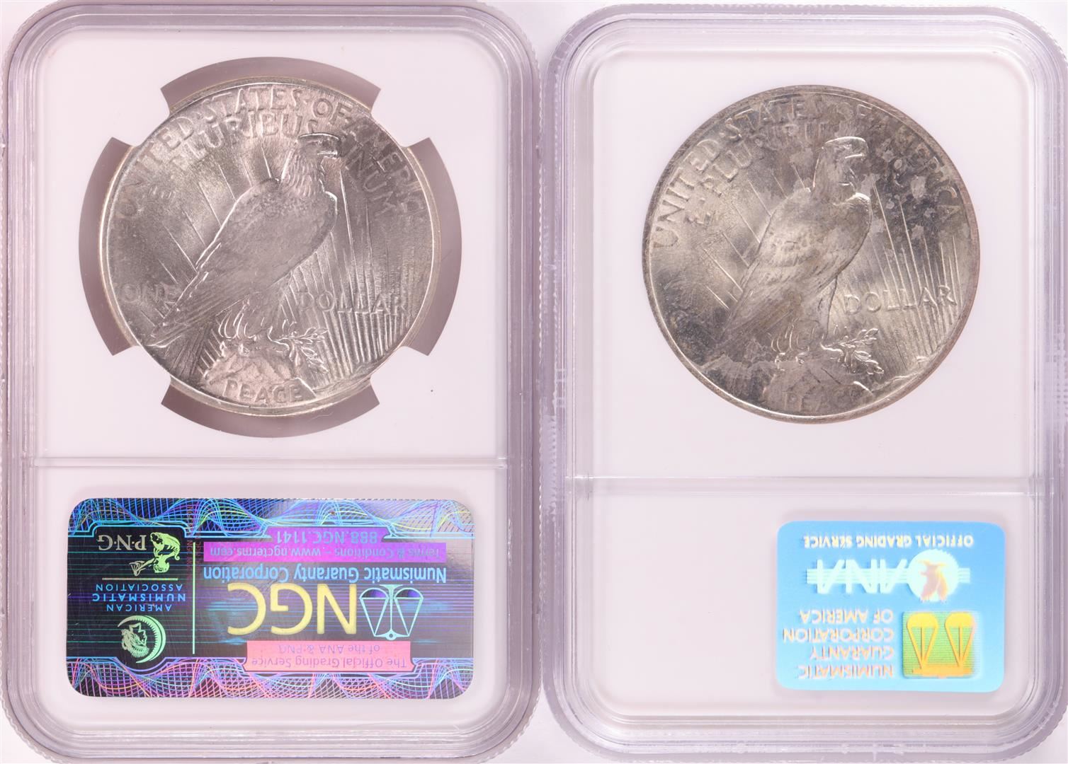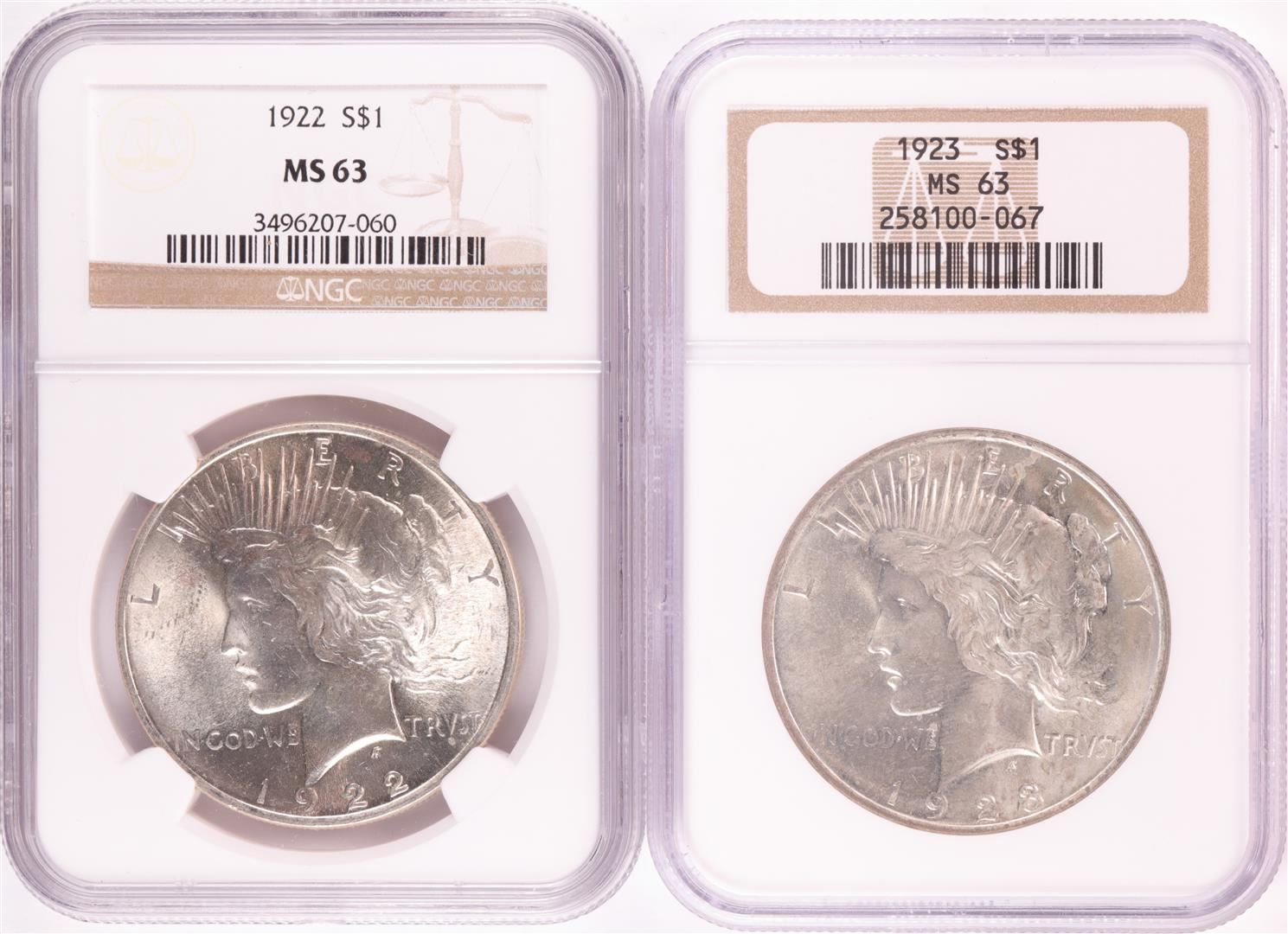 One Lot of 1922-1923 $1 Peace Silver Dollar Coins NGC MS63. NGC Certified.
