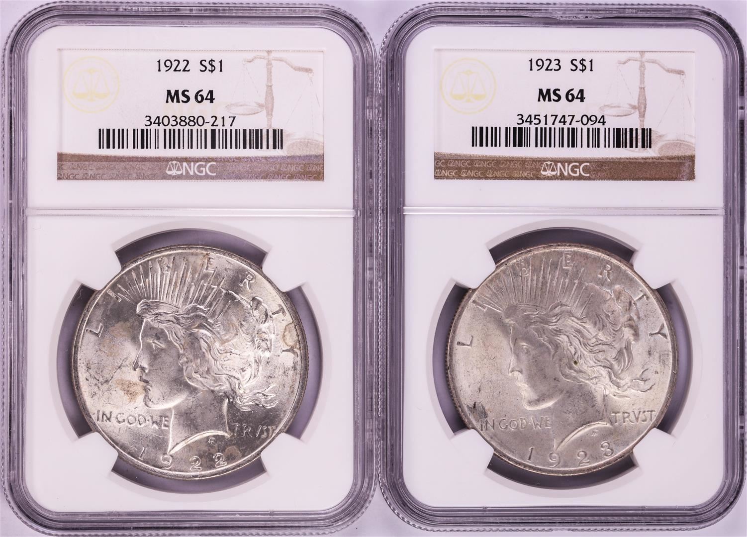 One Lot of 1922-1923 $1 Peace Silver Dollar Coins NGC MS64. NGC Certified.