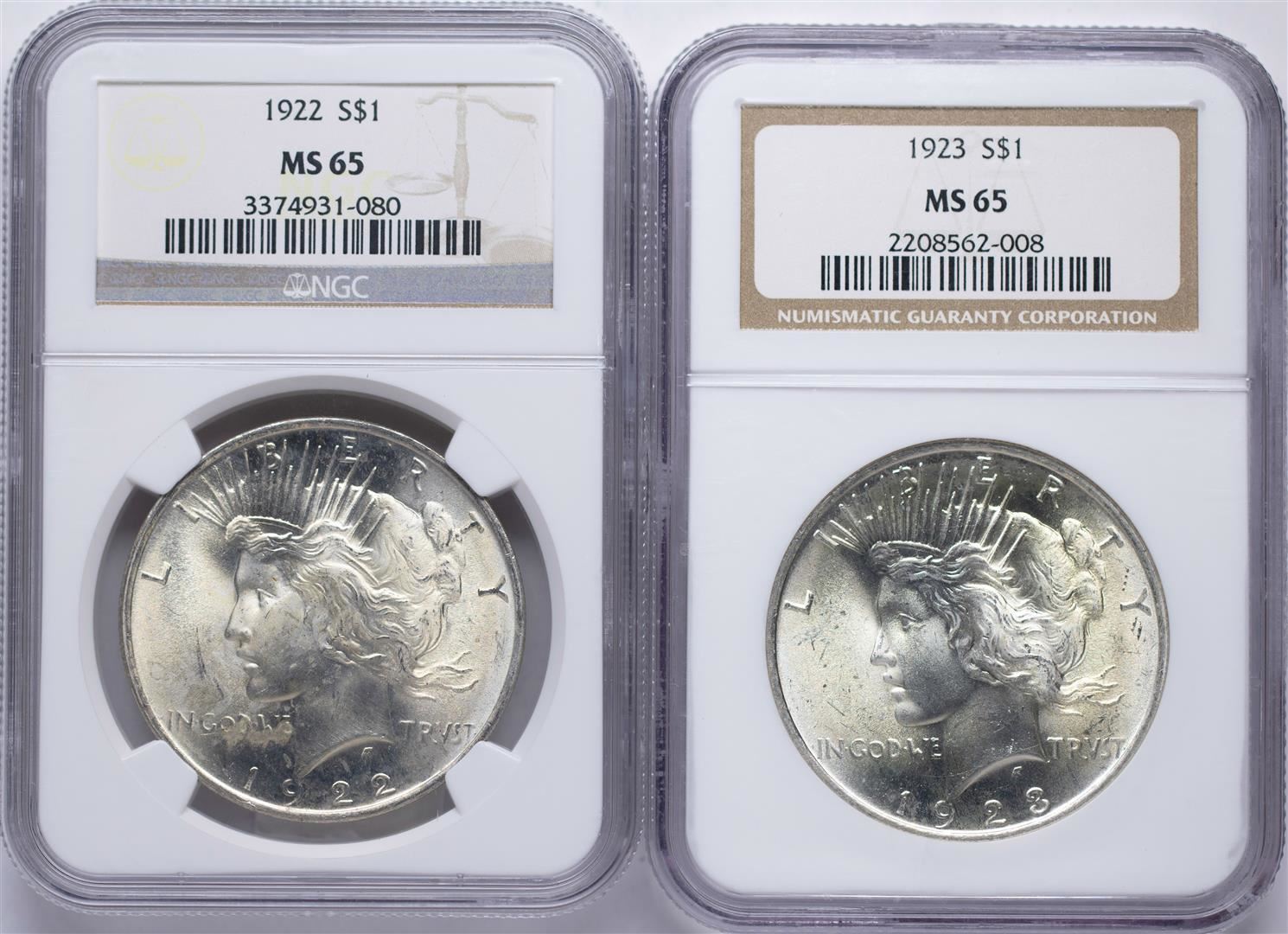One Lot of 1922-1923 $1 Peace Silver Dollar Coins NGC MS65. NGC Certified.