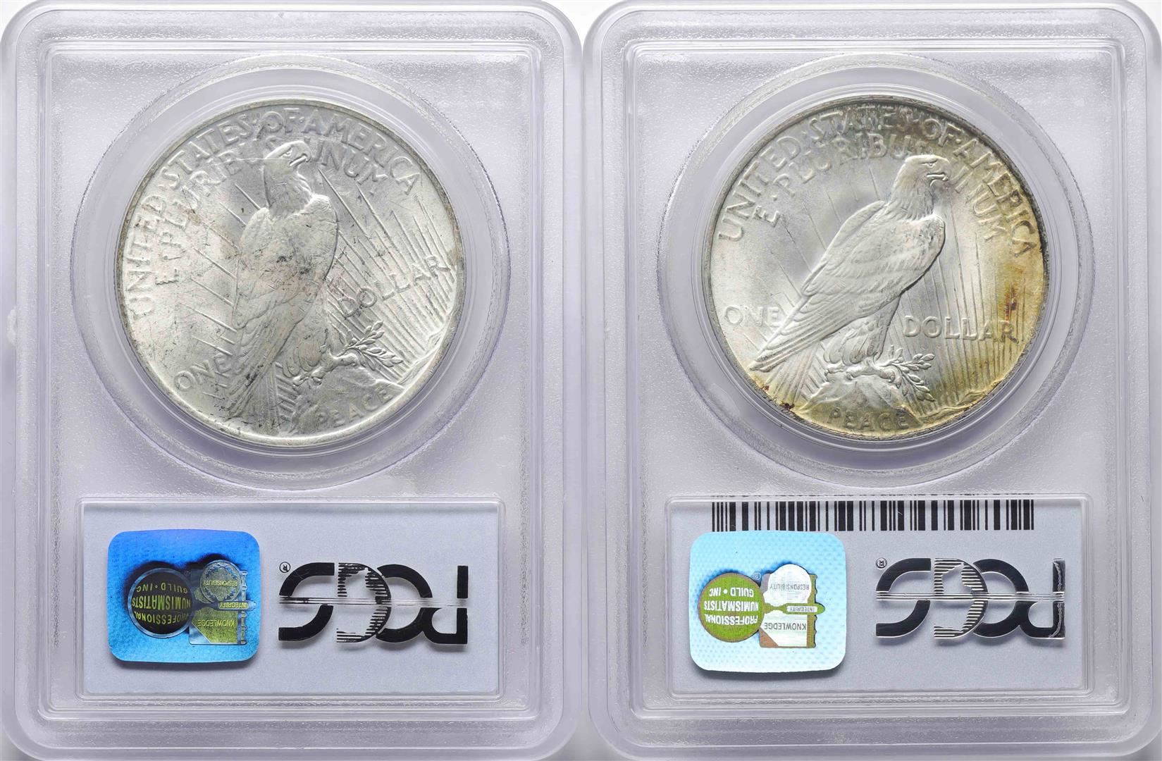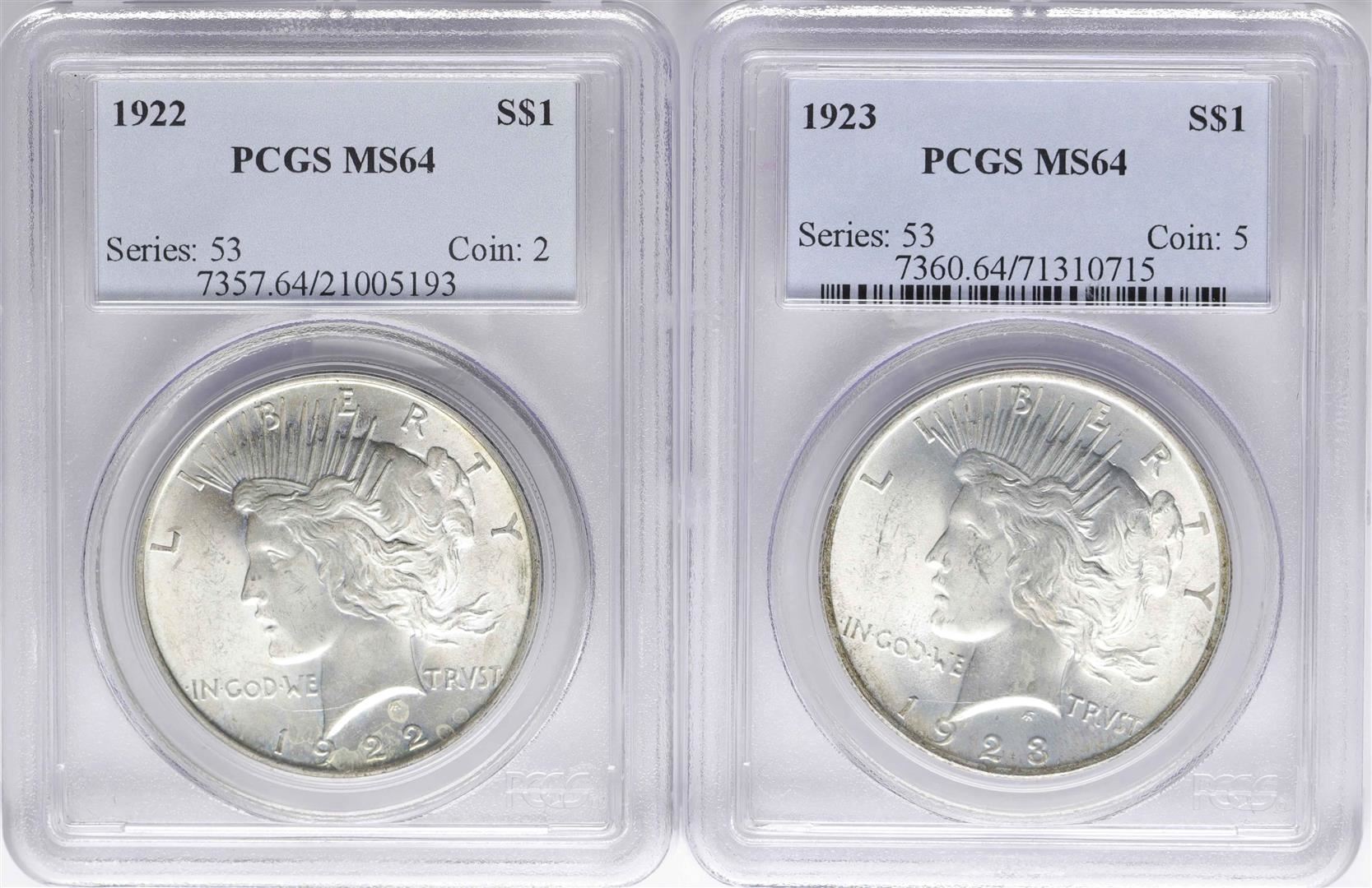 One Lot of 1922-1923 $1 Peace Silver Dollar Coins PCGS MS64. PCGS Graded.