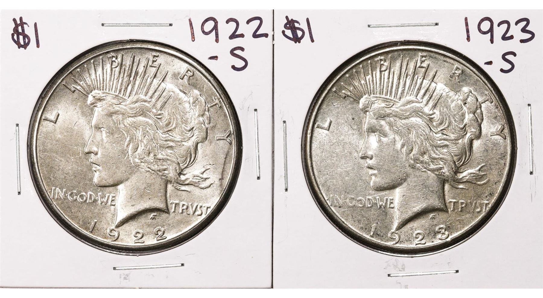 One Lot of 1922-S & 1923-S $1 Peace Silver Dollar Coins.