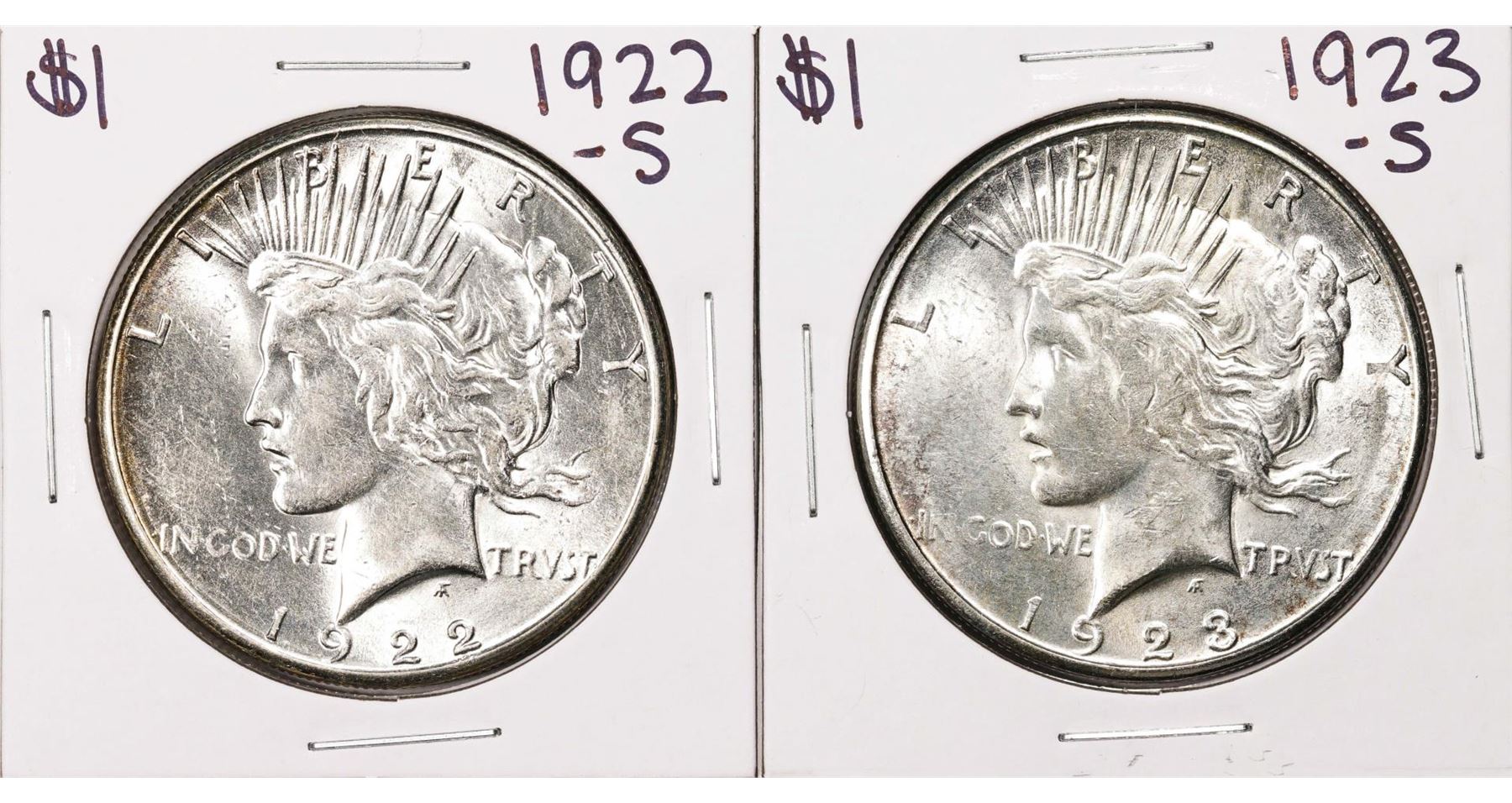 One Lot of 1922-S & 1923-S $1 Peace Silver Dollar Coins.