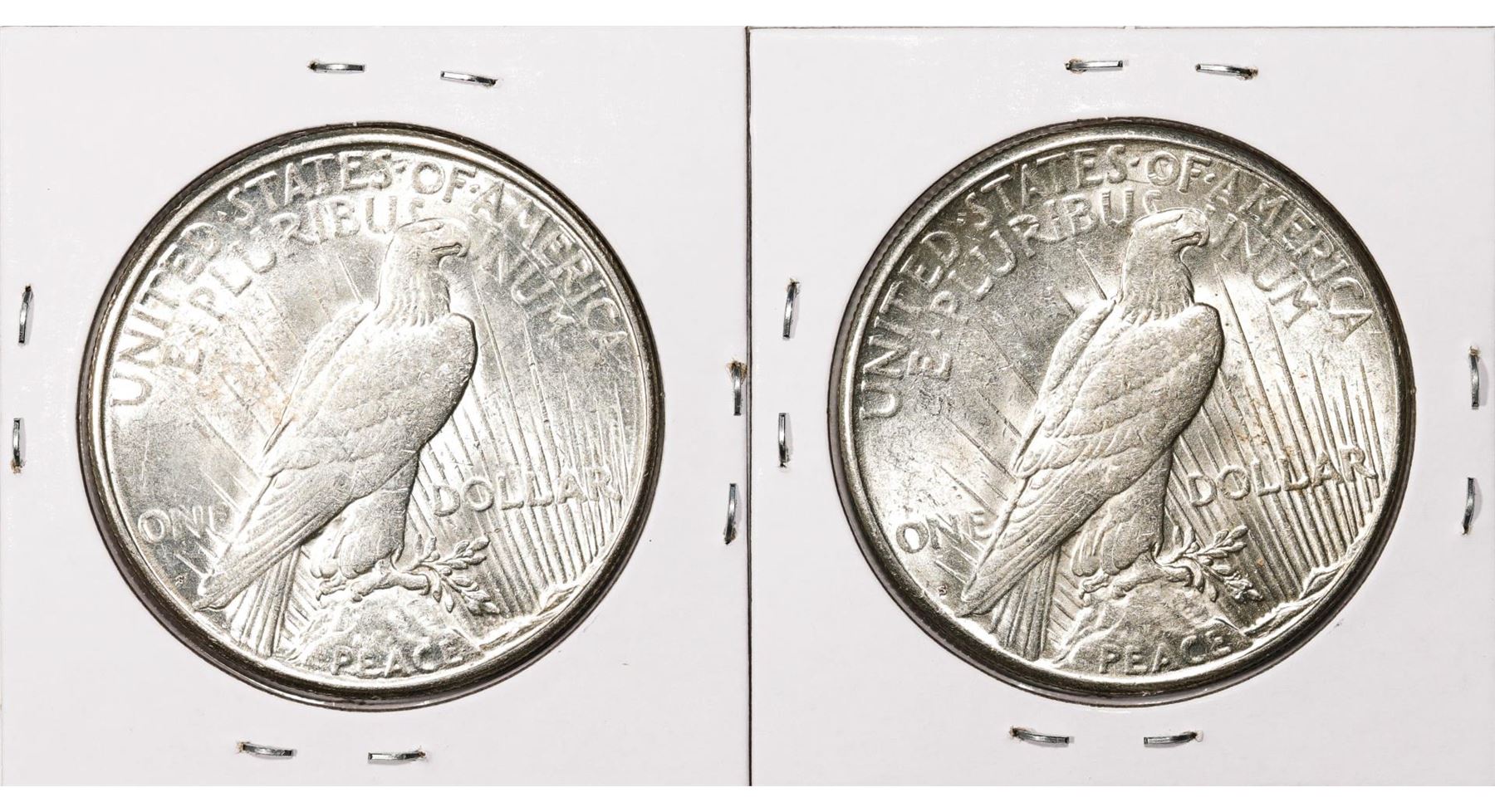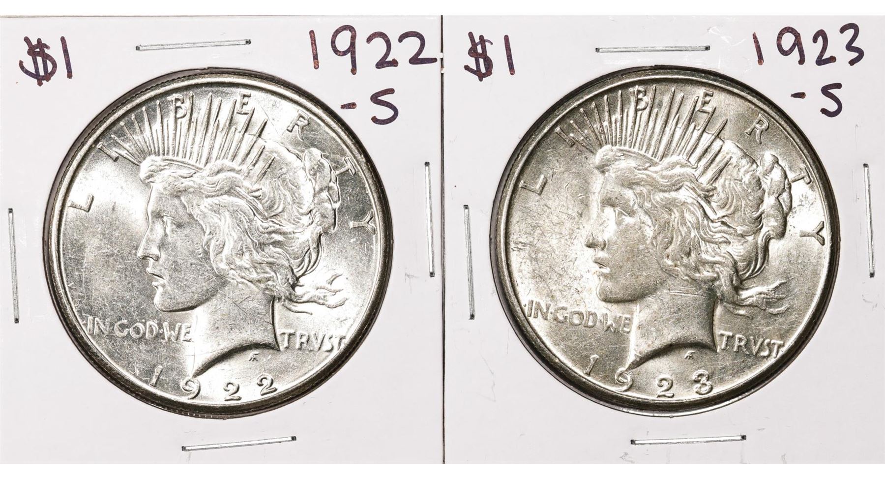 One Lot of 1922-S & 1923-S $1 Peace Silver Dollar Coins.