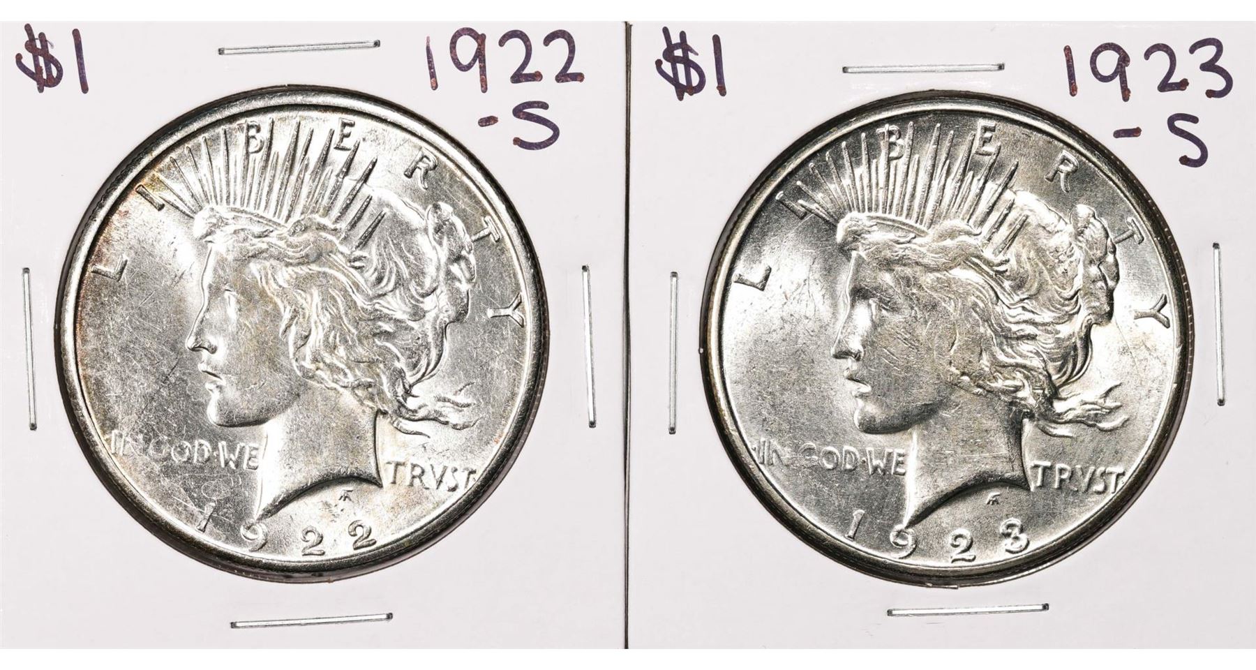 One Lot of 1922-S & 1923-S $1 Peace Silver Dollar Coins.