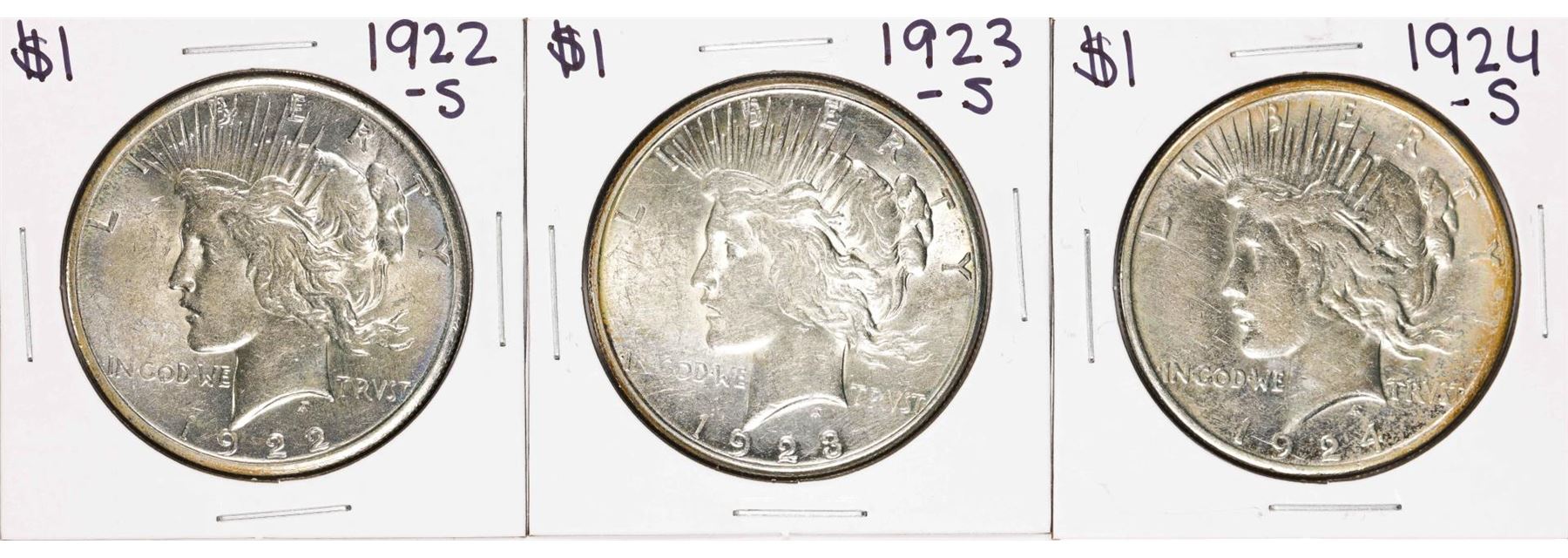 Lot of 1922-S, 1923-S & 1924-S $1 Peace Silver Dollar Coins