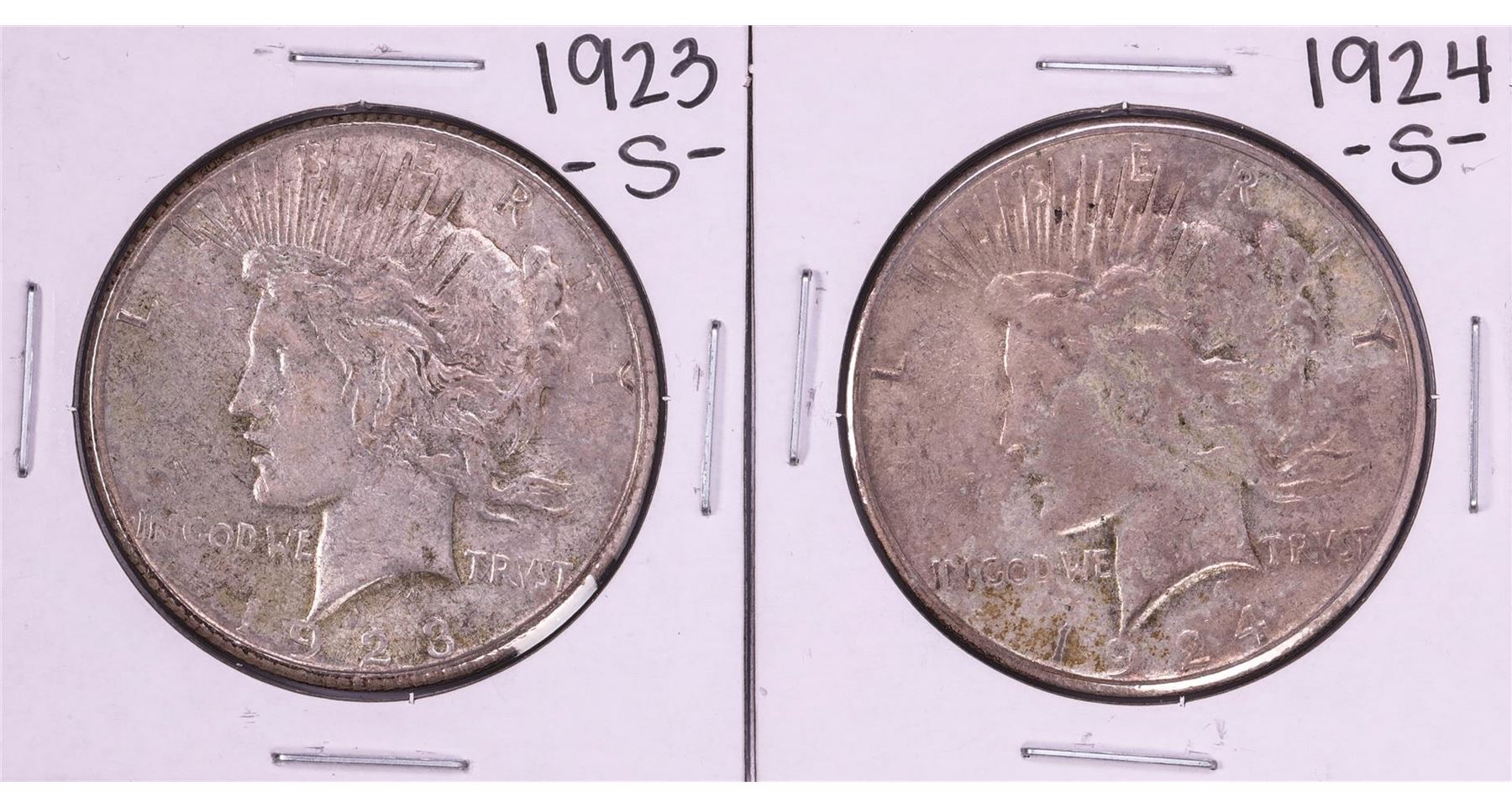 One Lot of 1923-S & 1924-S $1 Peace Silver Dollar Coins.
