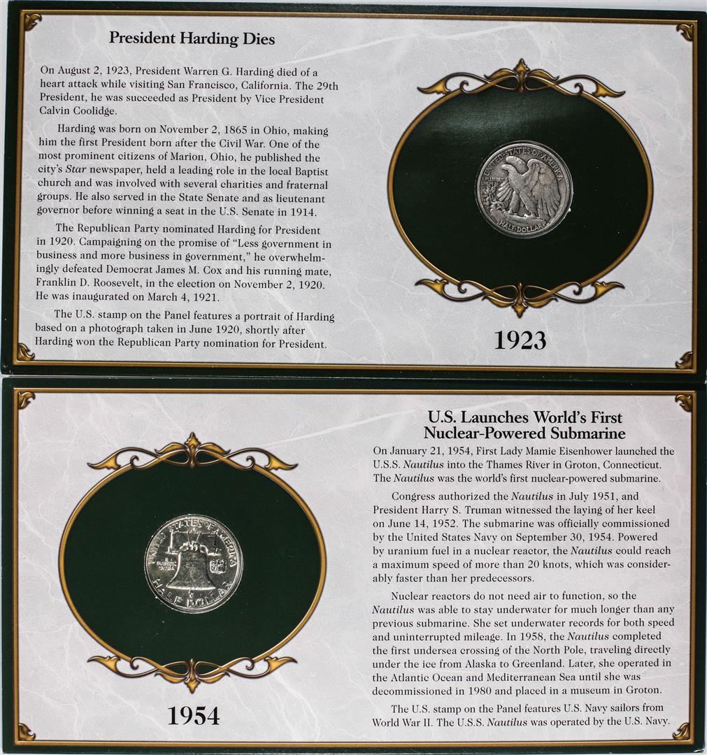 One Lot of 1923-S Walking Liberty & 1954 Franklin Half Dollar Coins and Stamp Panels.