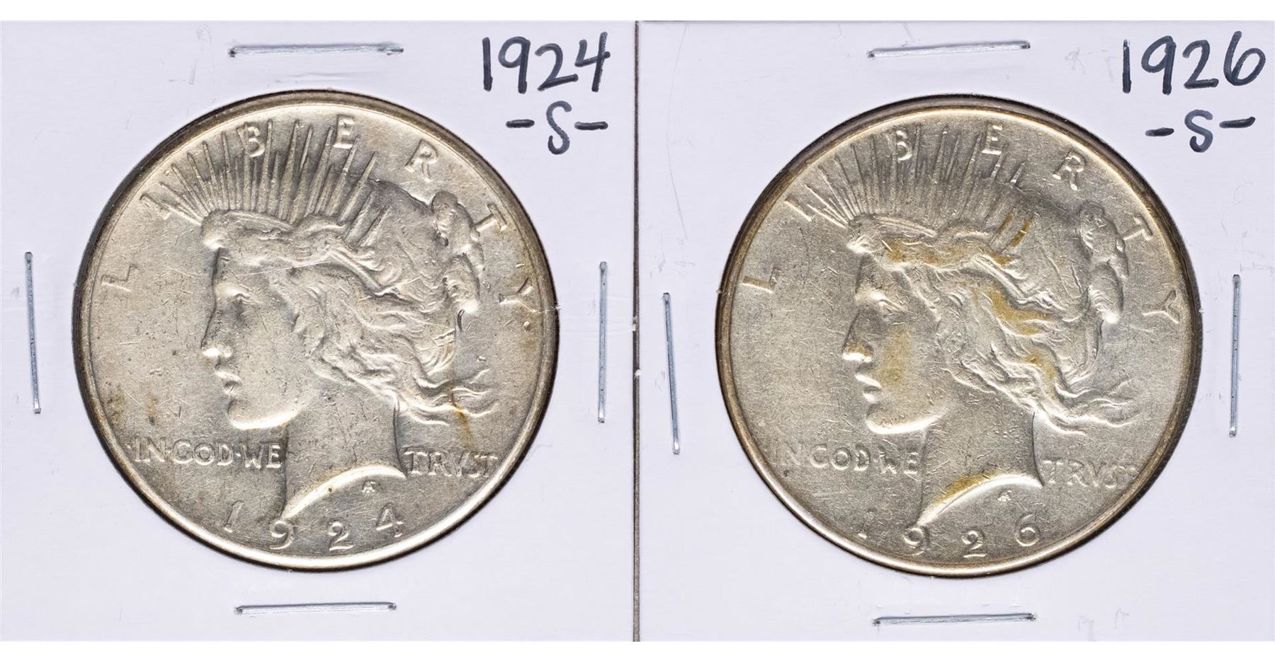 One Lot of 1924-S & 1926-S $1 Peace Silver Dollar Coins.