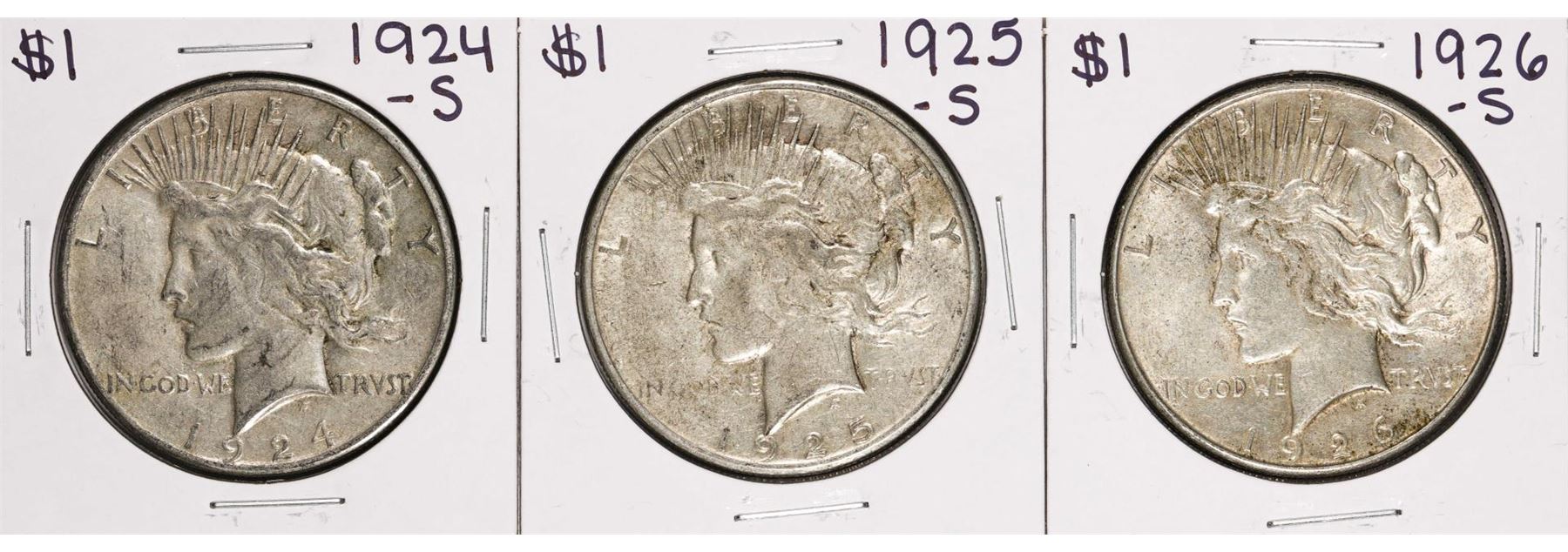 One Lot of 1924-S to 1926-S $1 Peace Silver Dollar Coins.
