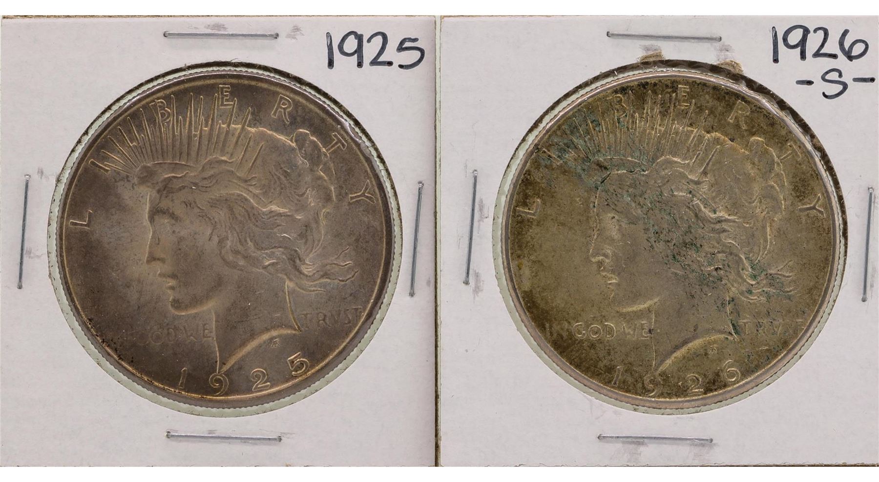 One Lot of 1925 & 1926-S $1 Peace Silver Dollar Coins.