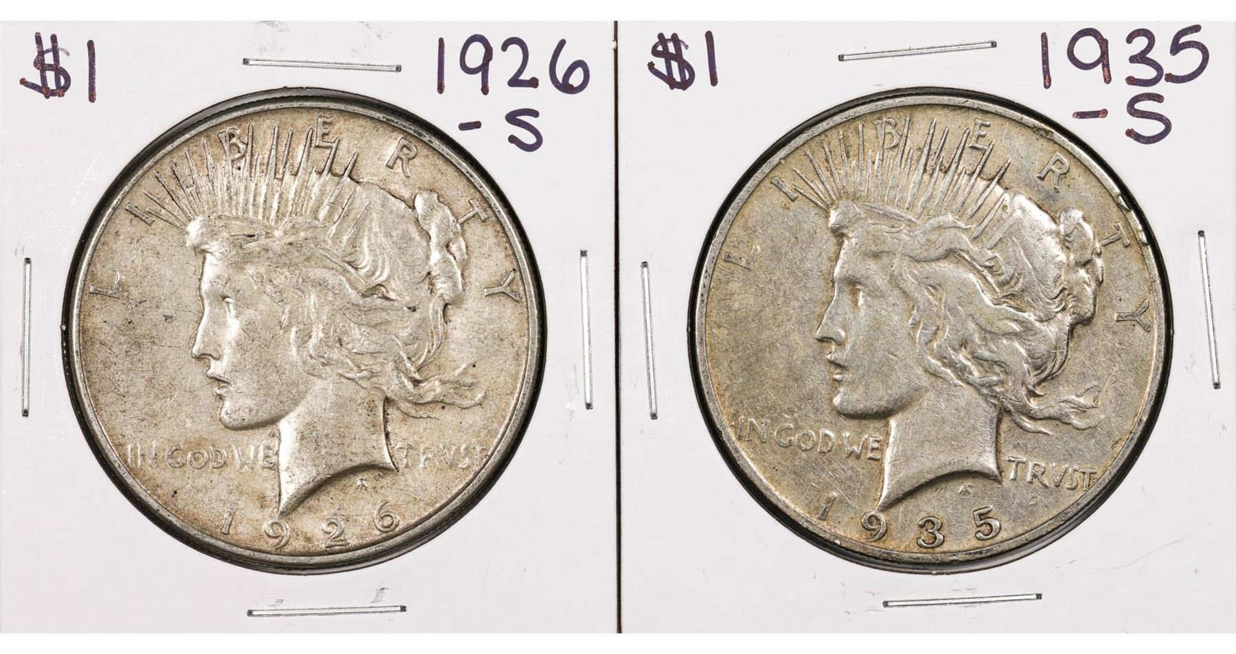 One Lot of 1926-S & 1935-S $1 Peace Silver Dollar Coins.