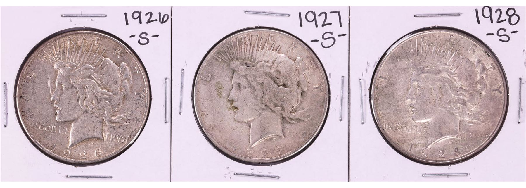 One Lot of 1926-S to 1928-S $1 Peace Silver Dollar Coins.