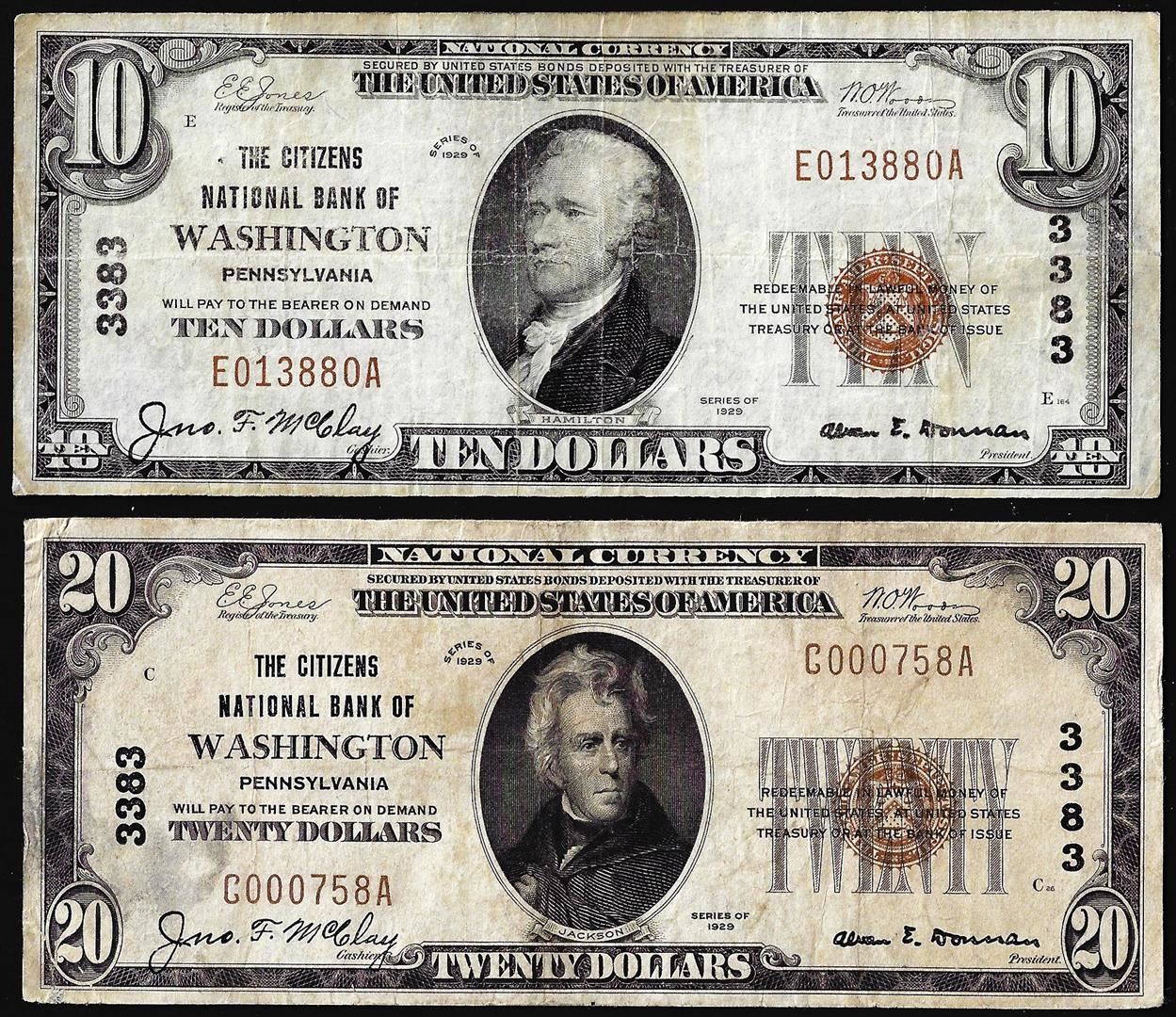 One Lot of 1929 $10/20 Citizens NB Washington, PA CH# 3383 National Currency Notes.