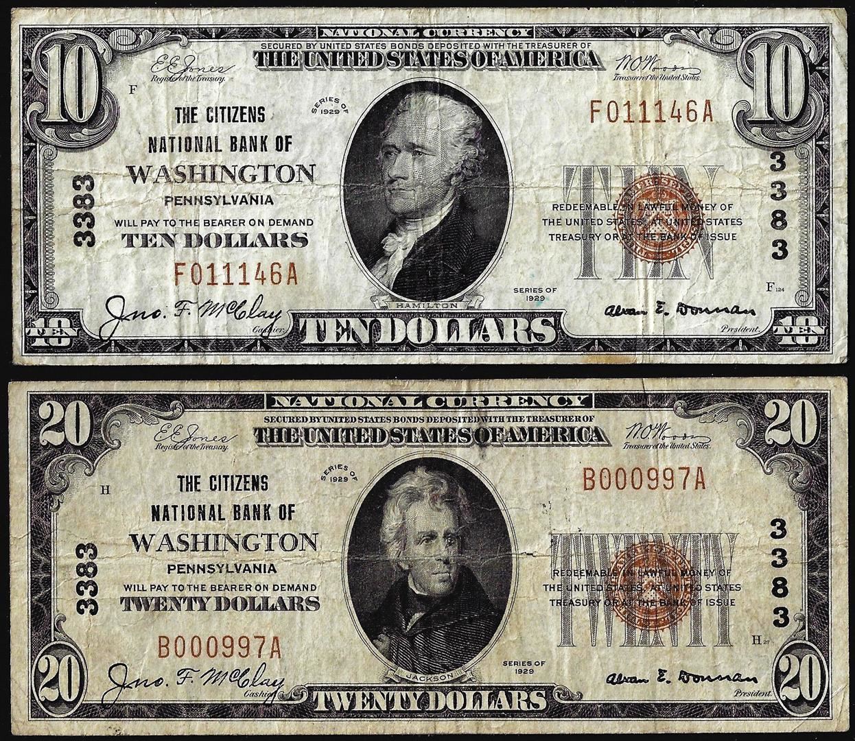 One Lot of 1929 $10/20 Citizens NB Washington, PA CH# 3383 National Currency Notes.