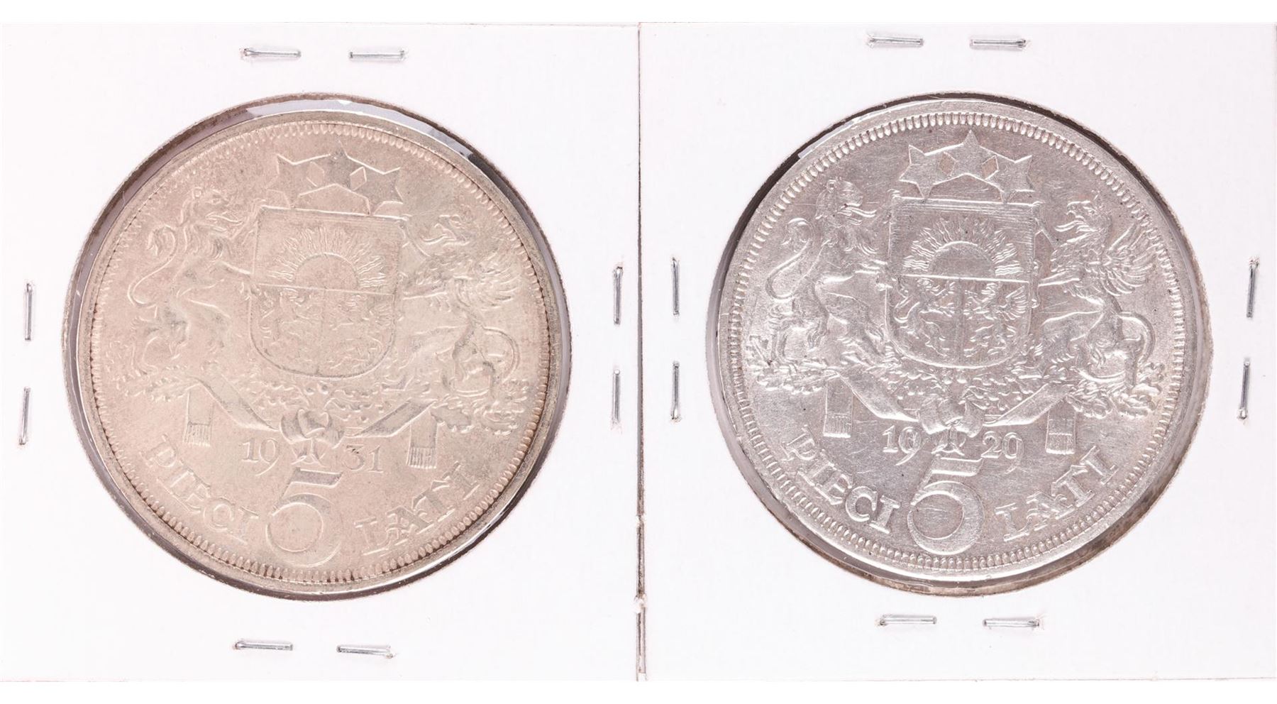 One Lot of 1929 & 1931 Latvia 5 Lati Silver Coins.
