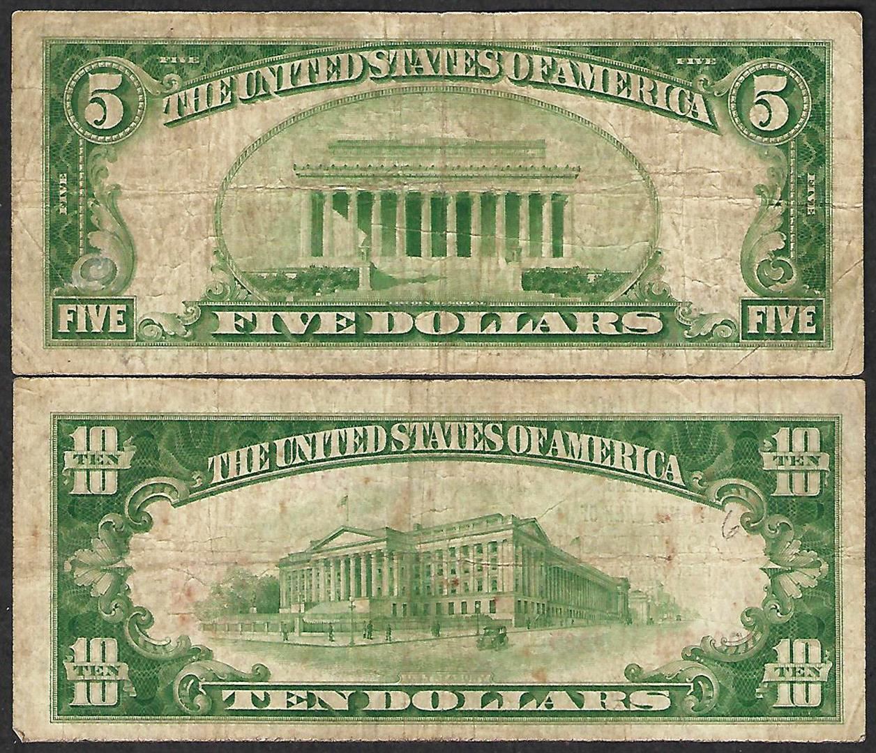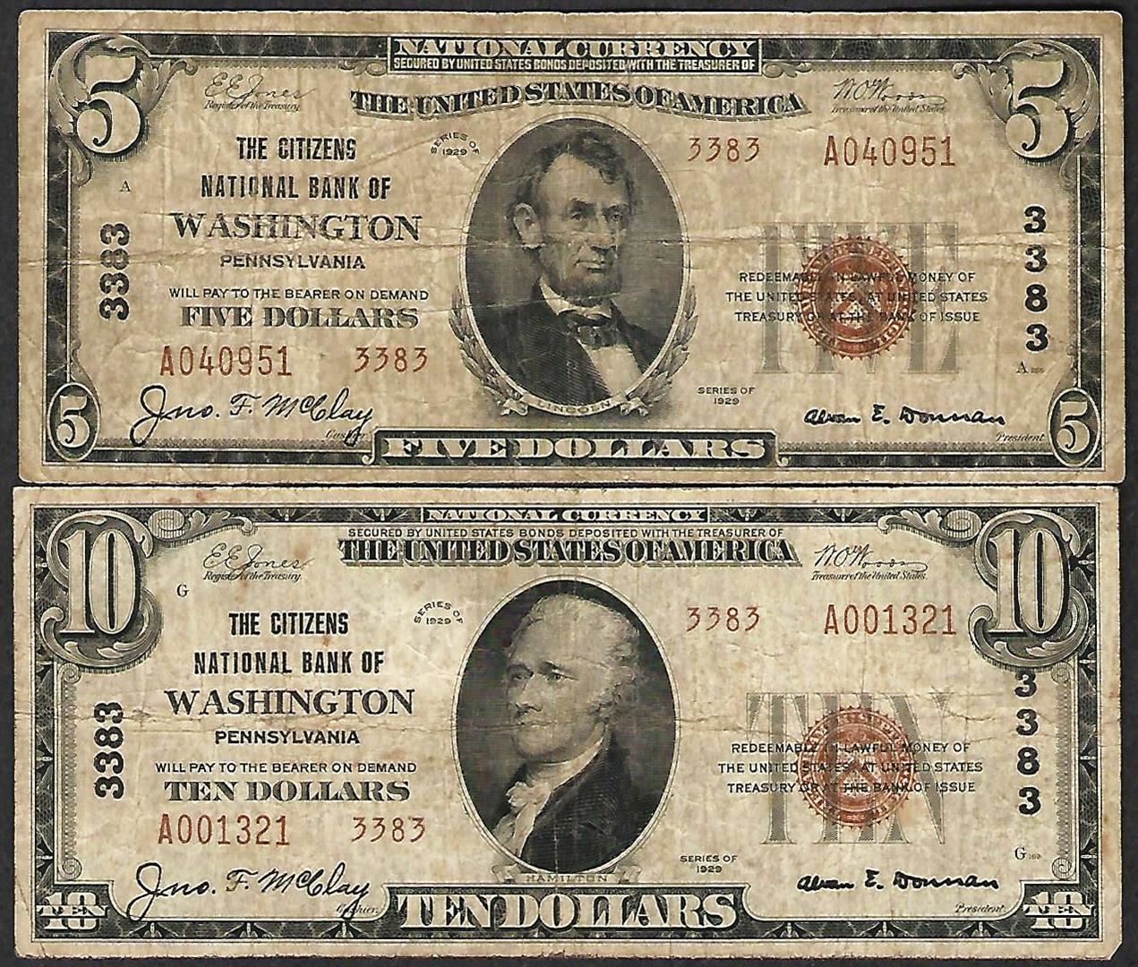 Lot of 1929 Ty. 2 $5/10 Citizens NB of Washington, PA CH# 3383 National Currency Notes