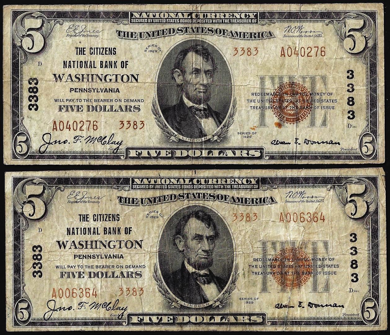Lot of 1929 Type 2 $5 Citizens NB of Washington, PA CH# 3383 National Currency Notes