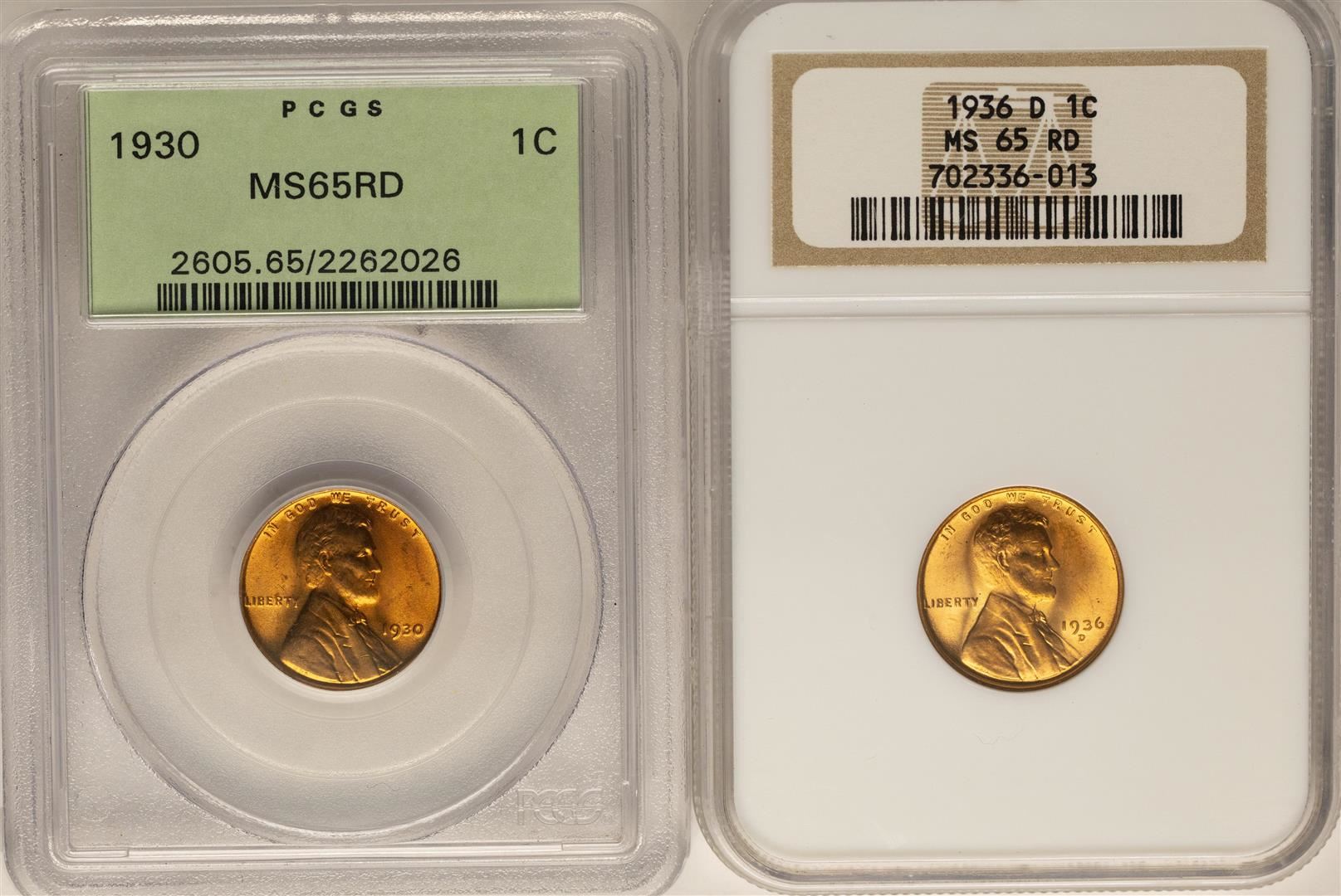 One Lot of 1930 & 1936-D Lincoln Wheat Cent Coins PCGS/NGC MS65RD. PCGS Graded.
