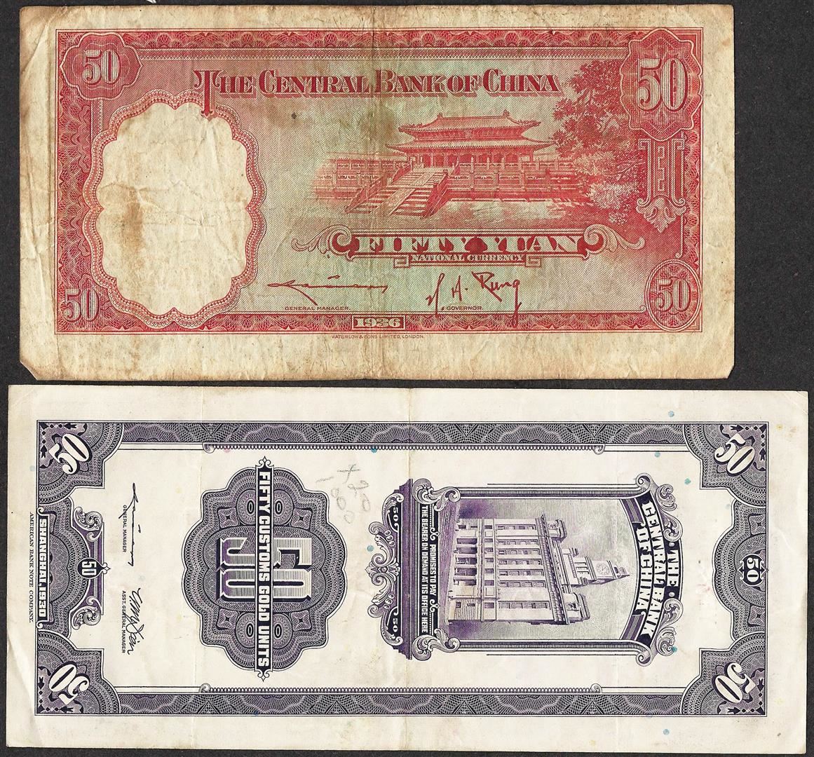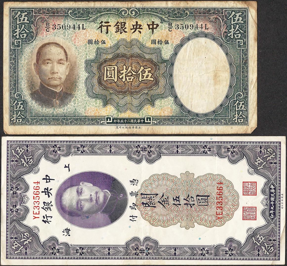 One Lot of 1930 50 Yuan and 1936 50 Gold Units Central Bank of China Notes.