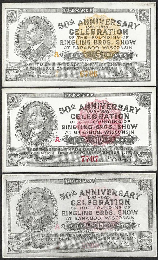 Lot of 1933 50th Anniversary Ringling Bros Show 5/10/15 Cents Baraboo, WI Obsolete Scrips