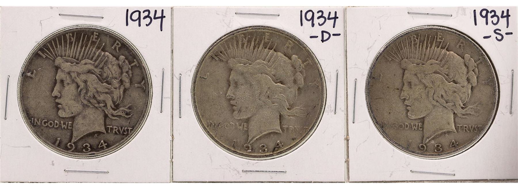 Lot of 1934, 1934-D, & 1934-S $1 Peace Silver Dollar Coins