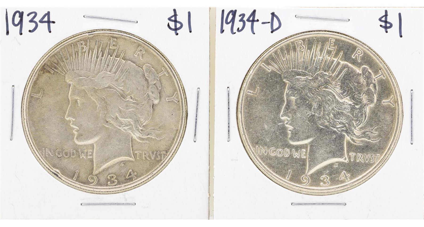 One Lot of 1934 & 1934-D $ Peace Silver Dollar Coins.