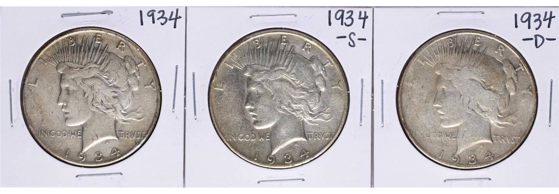 Lot of 1934, 1934-S, & 1934-D $1 Peace Silver Dollar Coins