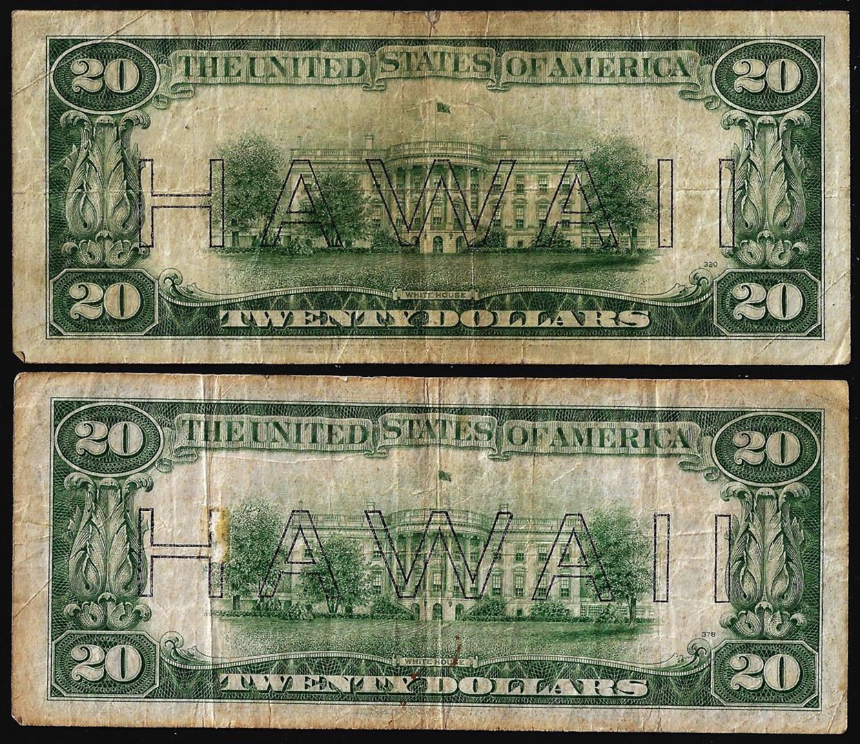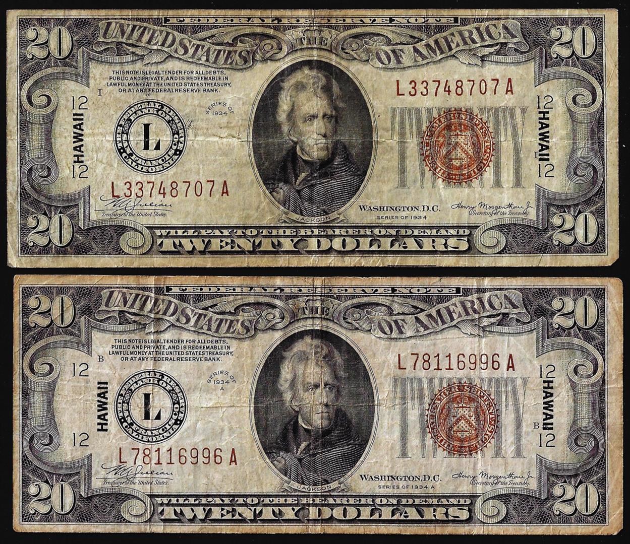One Lot of 1934 & 1934A $20 Hawaii WWII Emergency Issue Federal Reserve Notes.