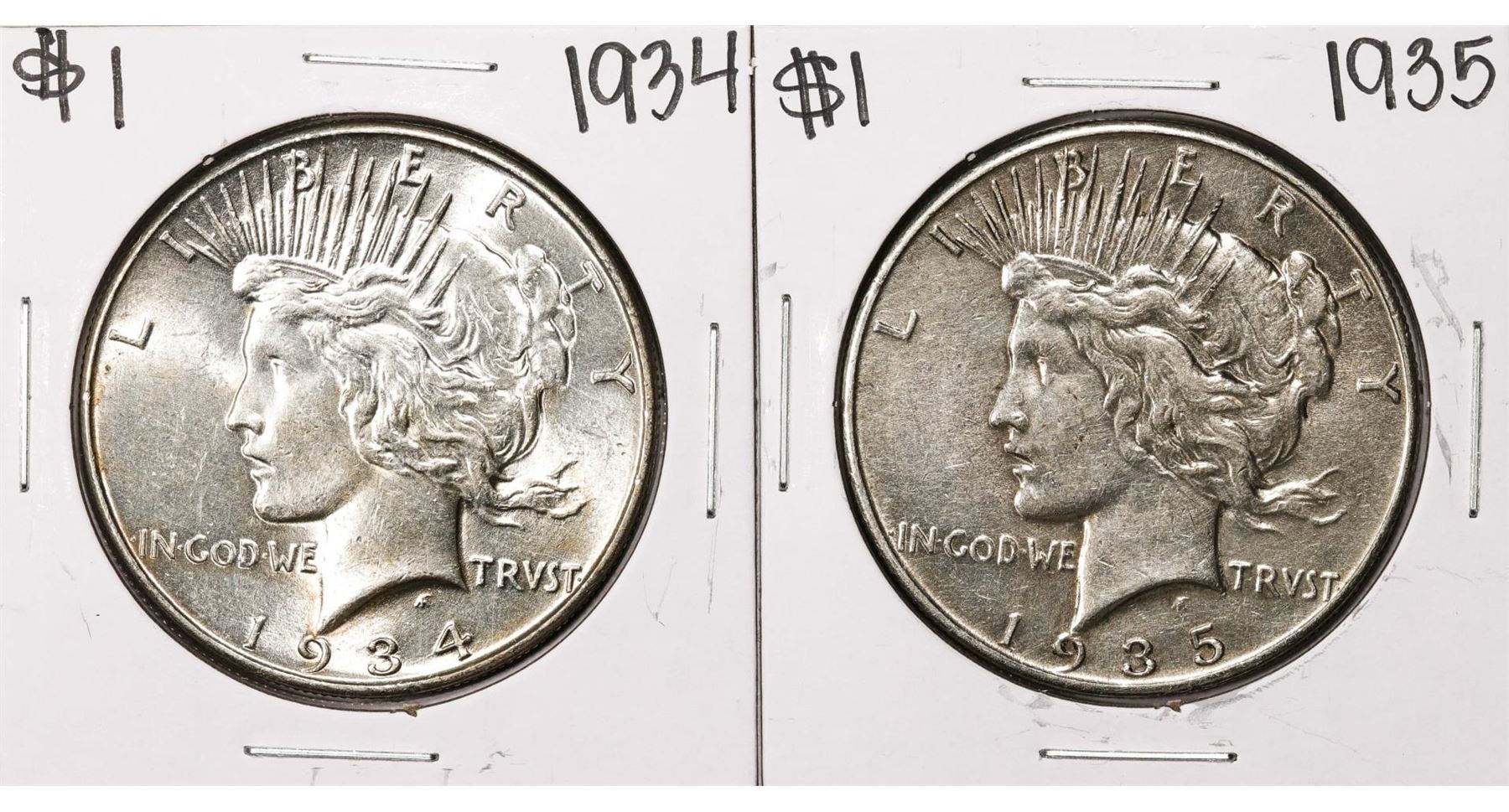 One Lot of 1934-1935 $1 Peace Silver Dollar Coins.
