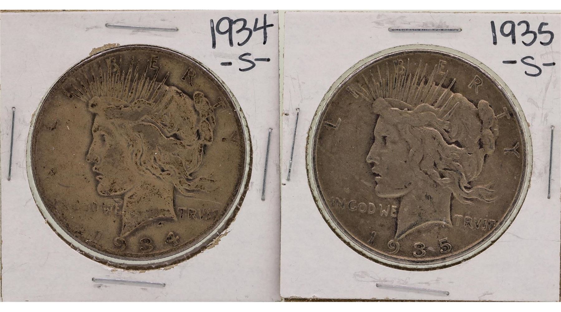 One Lot of 1934-S & 1935-S $1 Peace Silver Dollar Coins.