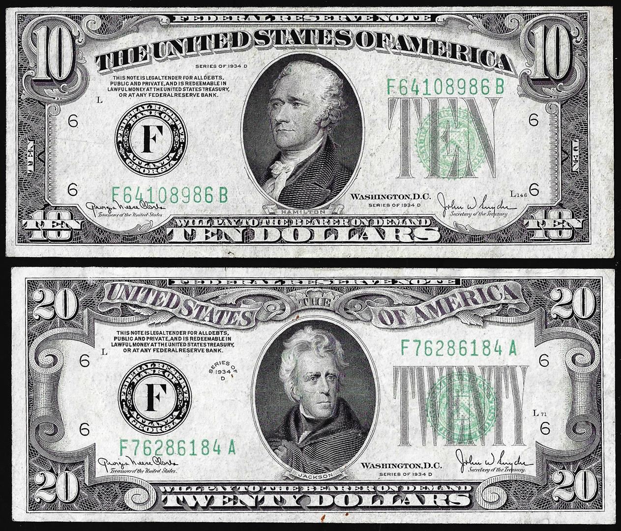 One Lot of 1934D $10 & $20 Federal Reserve Notes Atlanta.