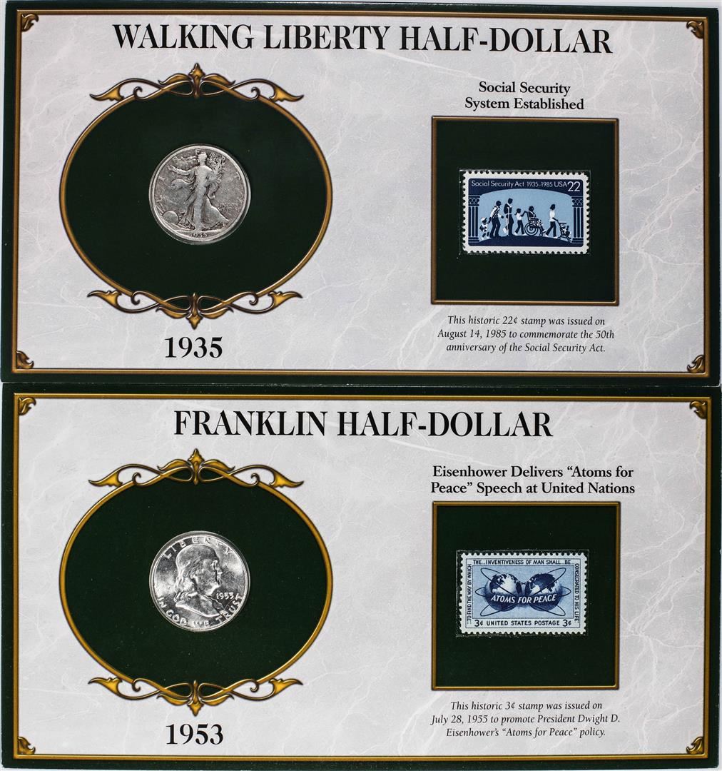 One Lot of 1935-S Walking Liberty & 1953-D Franklin Half Dollar Coins and Stamp Panels.