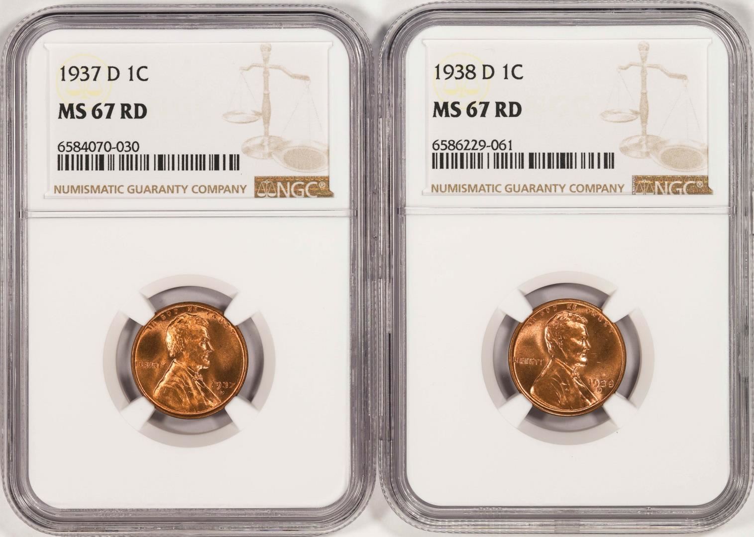 One Lot of 1937-D & 1938-D Lincoln Wheat Cent Coins NGC MS67RD. NGC Certified.