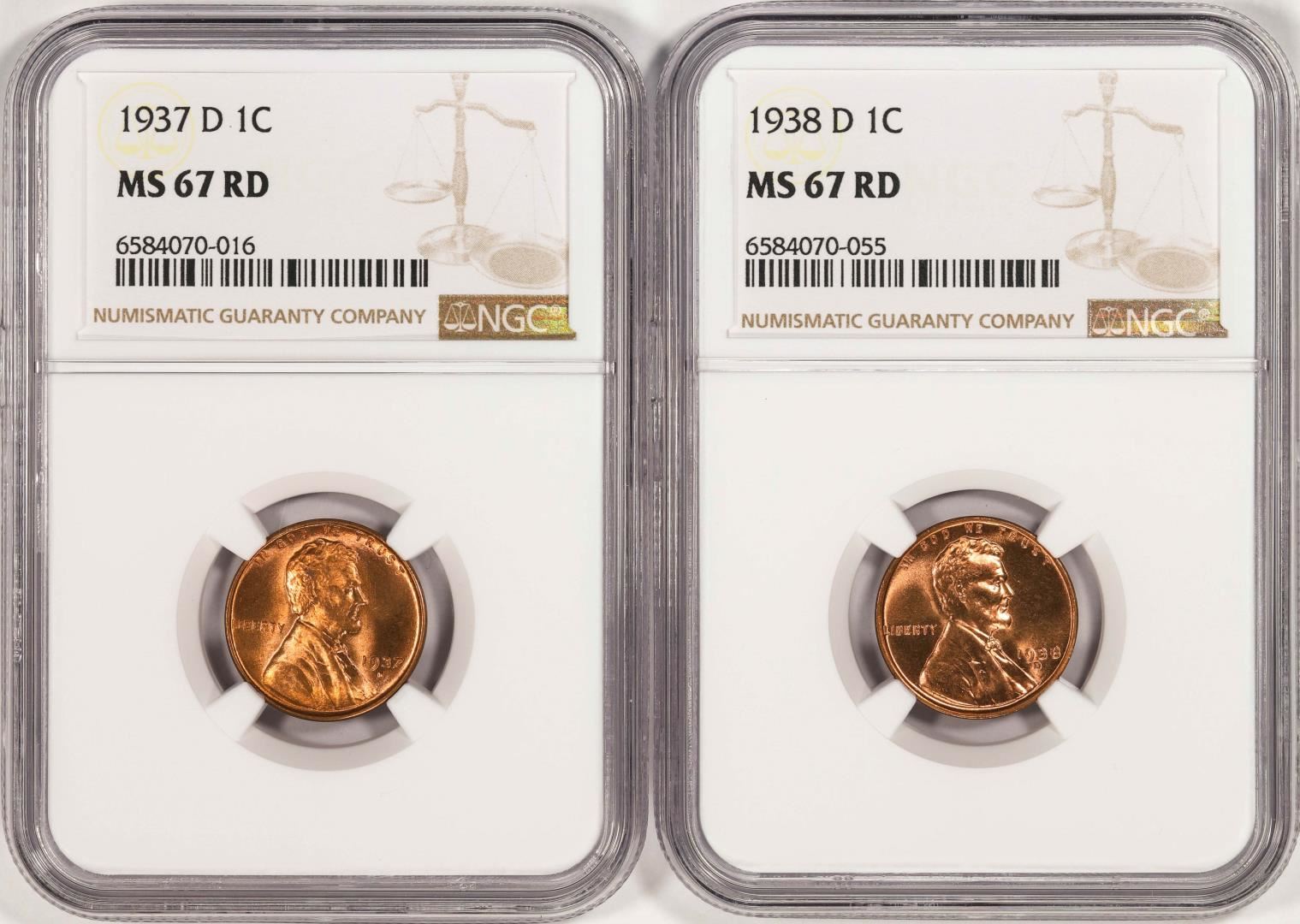 One Lot of 1937-D & 1938-D Lincoln Wheat Cent Coins NGC MS67RD. NGC Certified.