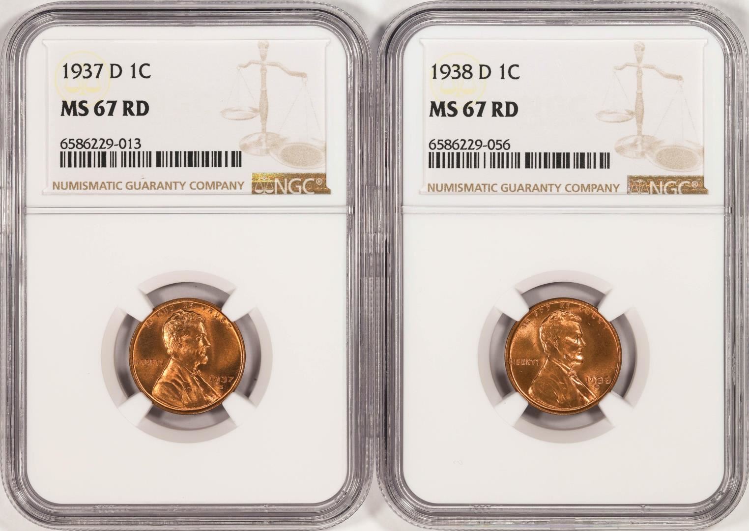 One Lot of 1937-D & 1938-D Lincoln Wheat Cent Coins NGC MS67RD. NGC Certified.