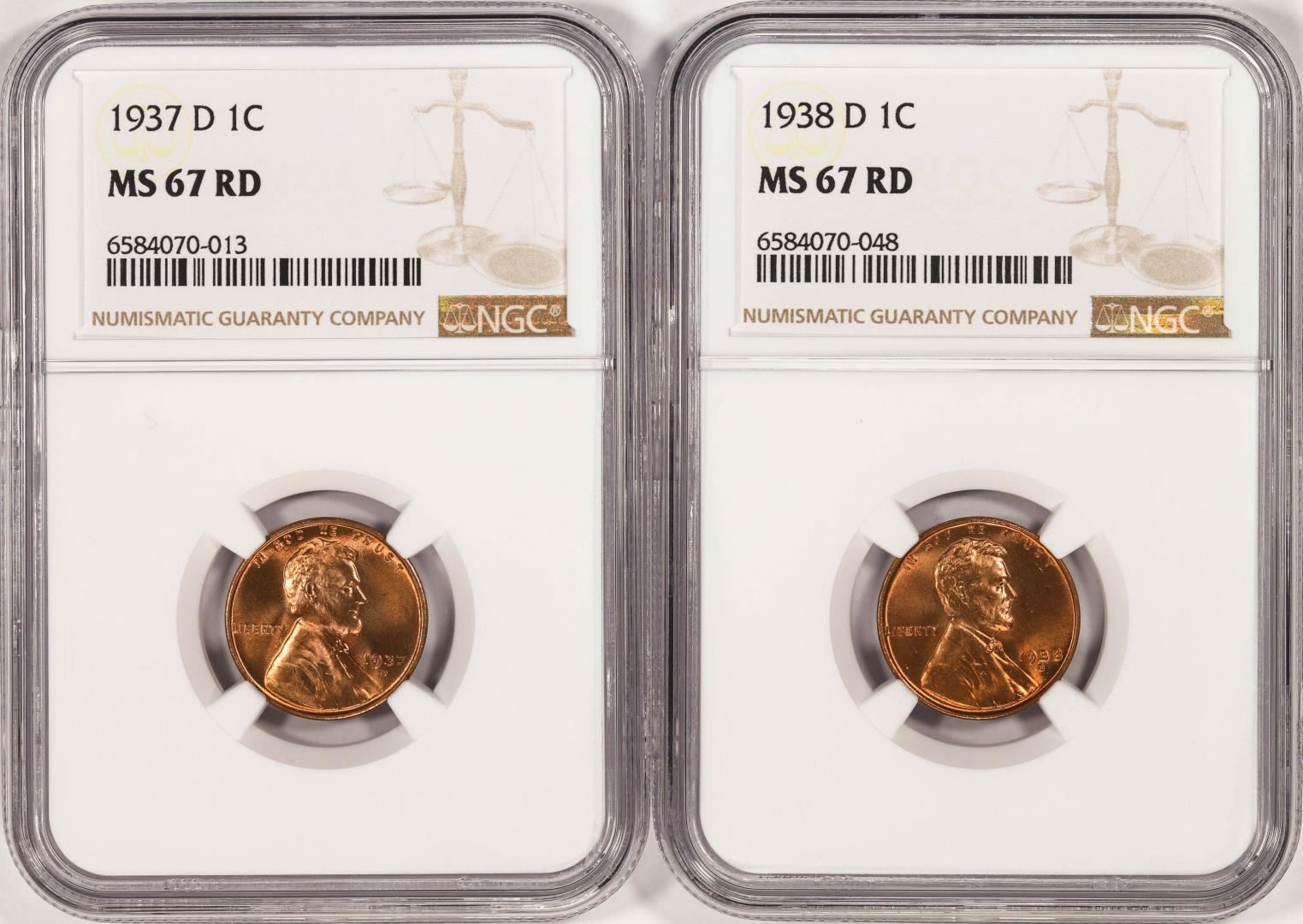 One Lot of 1937-D & 1938-D Lincoln Wheat Cent Coins NGC MS67RD. NGC Certified.