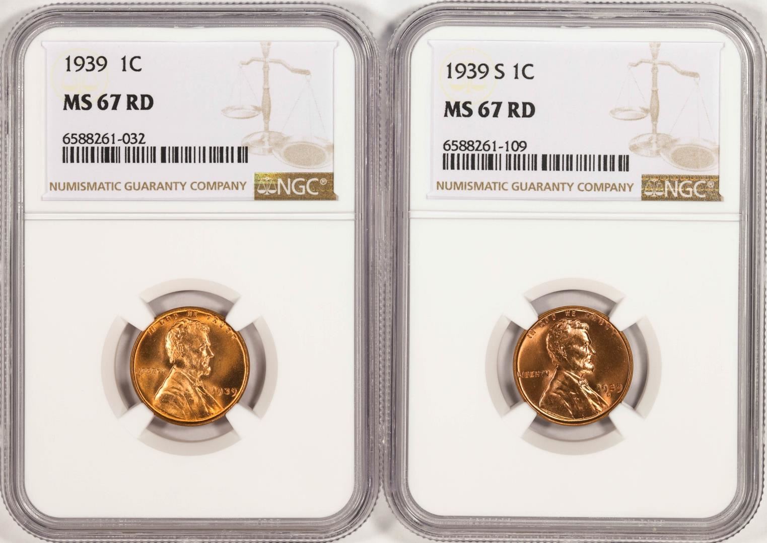 One Lot of 1939 & 1939-S Lincoln Wheat Cent Coins NGC MS67RD. NGC Certified.