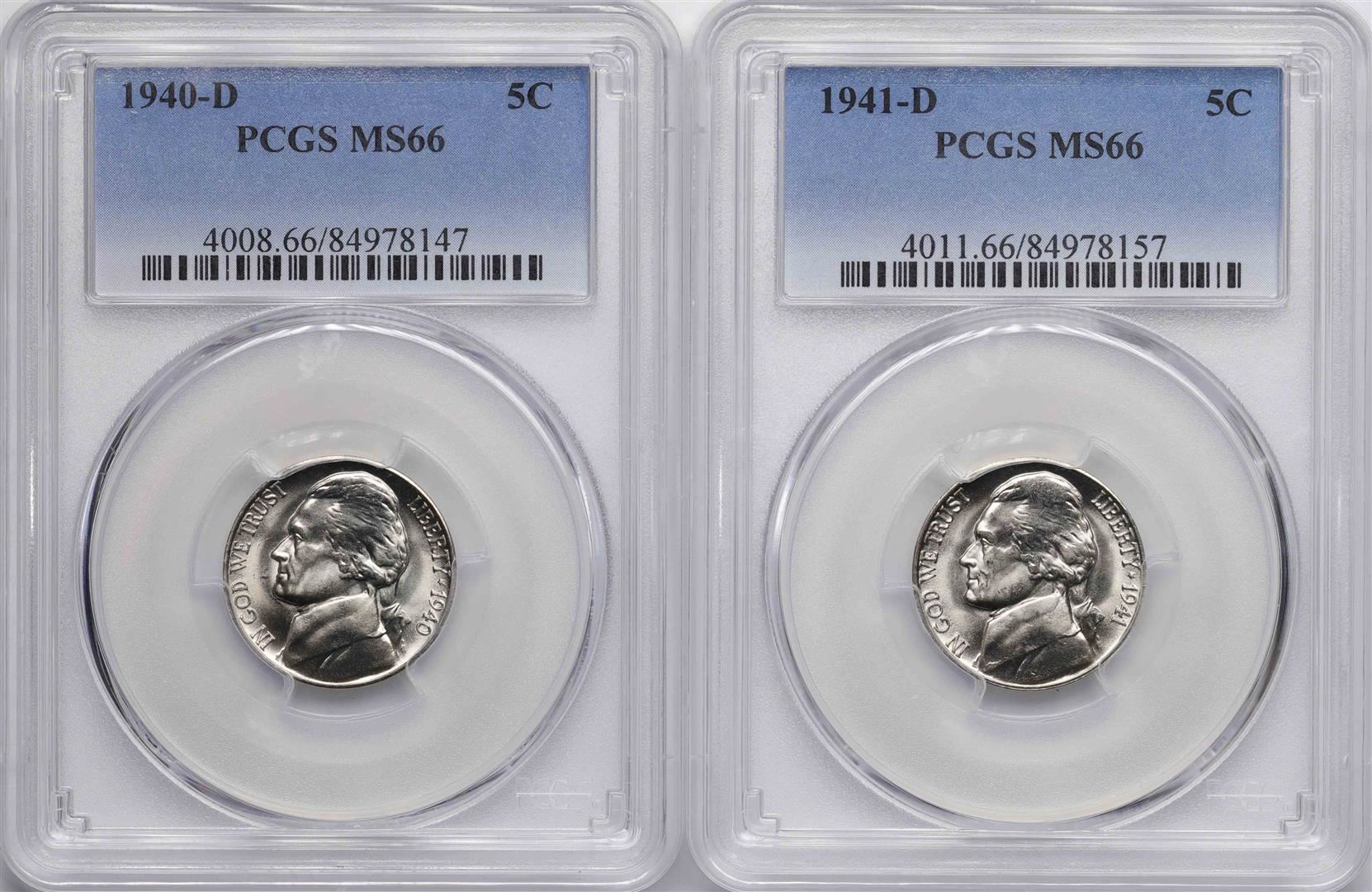 One Lot of 1940-D & 1941-D Jefferson Nickel Coins PCGS MS66. PCGS Graded.