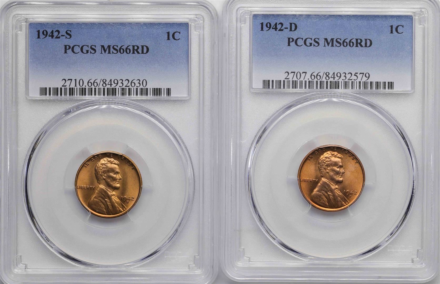 Lot of 1942-S & 1942-D Lincoln Wheat Cent Coins PCGS MS66RD