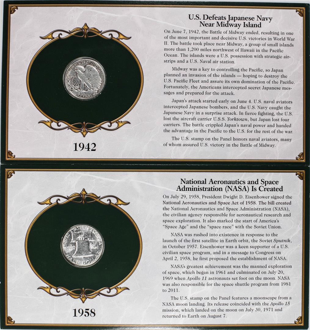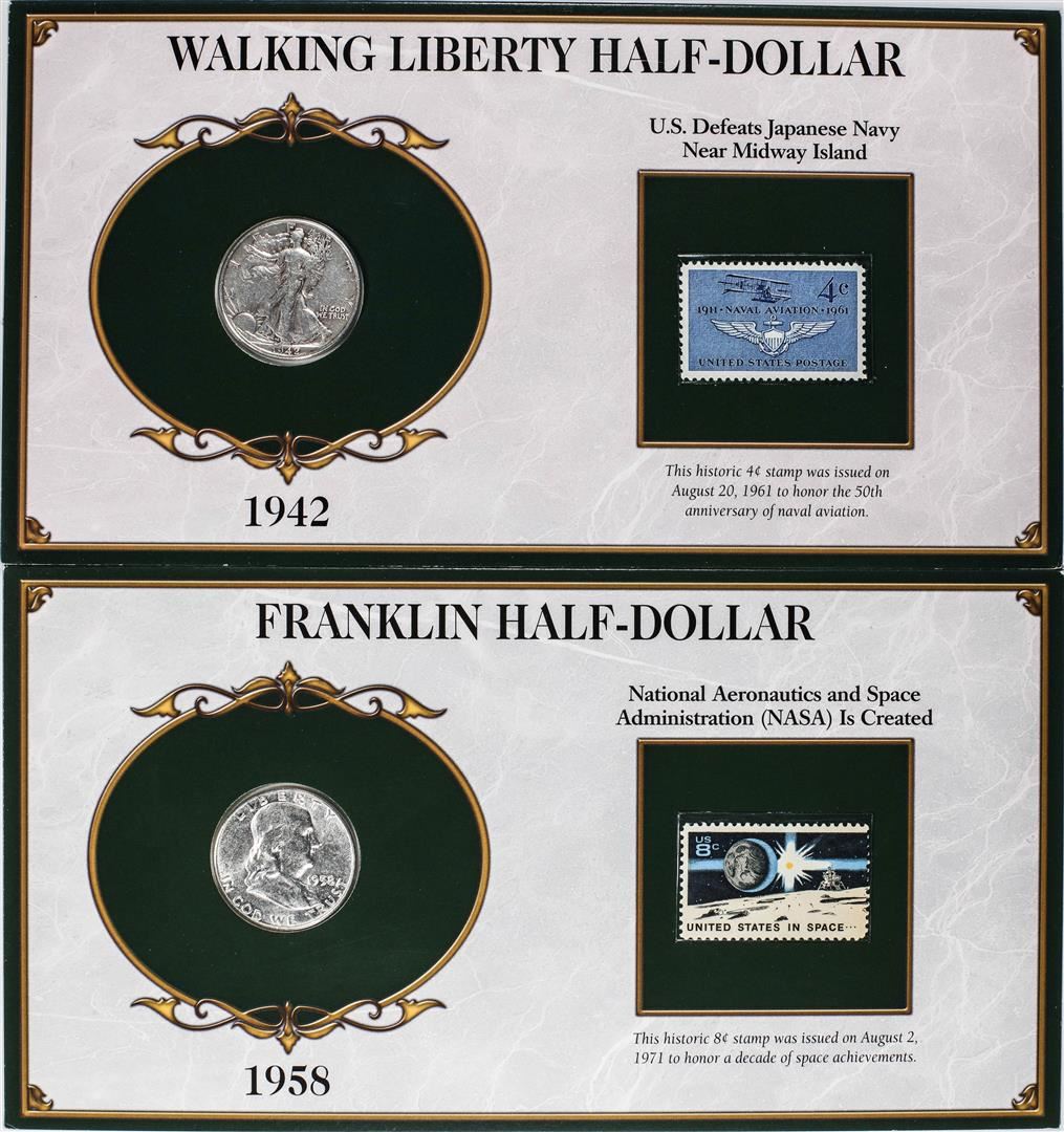 One Lot of 1942 Walking Liberty & 1958 Franklin Half Dollar Coins and Stamp Panels.