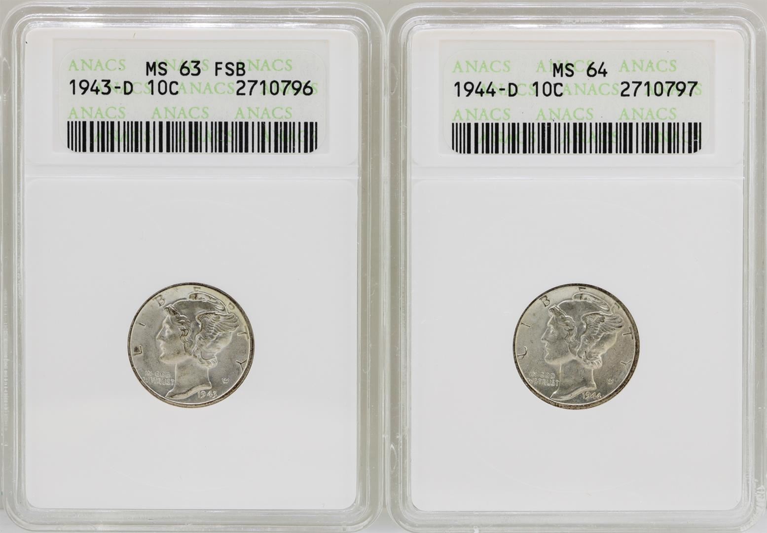 Lot of 1943-D Mercury Dime ANACS MS63FB & 1944-D Mercury Dime ANACS MS64