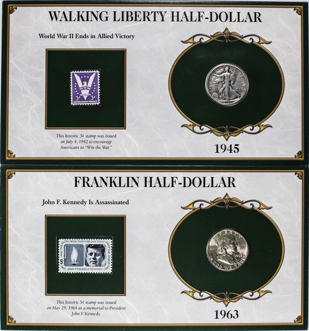 One Lot of 1945-S Walking Liberty & 1963-D Franklin Half Dollar Coins and Stamp Panels.